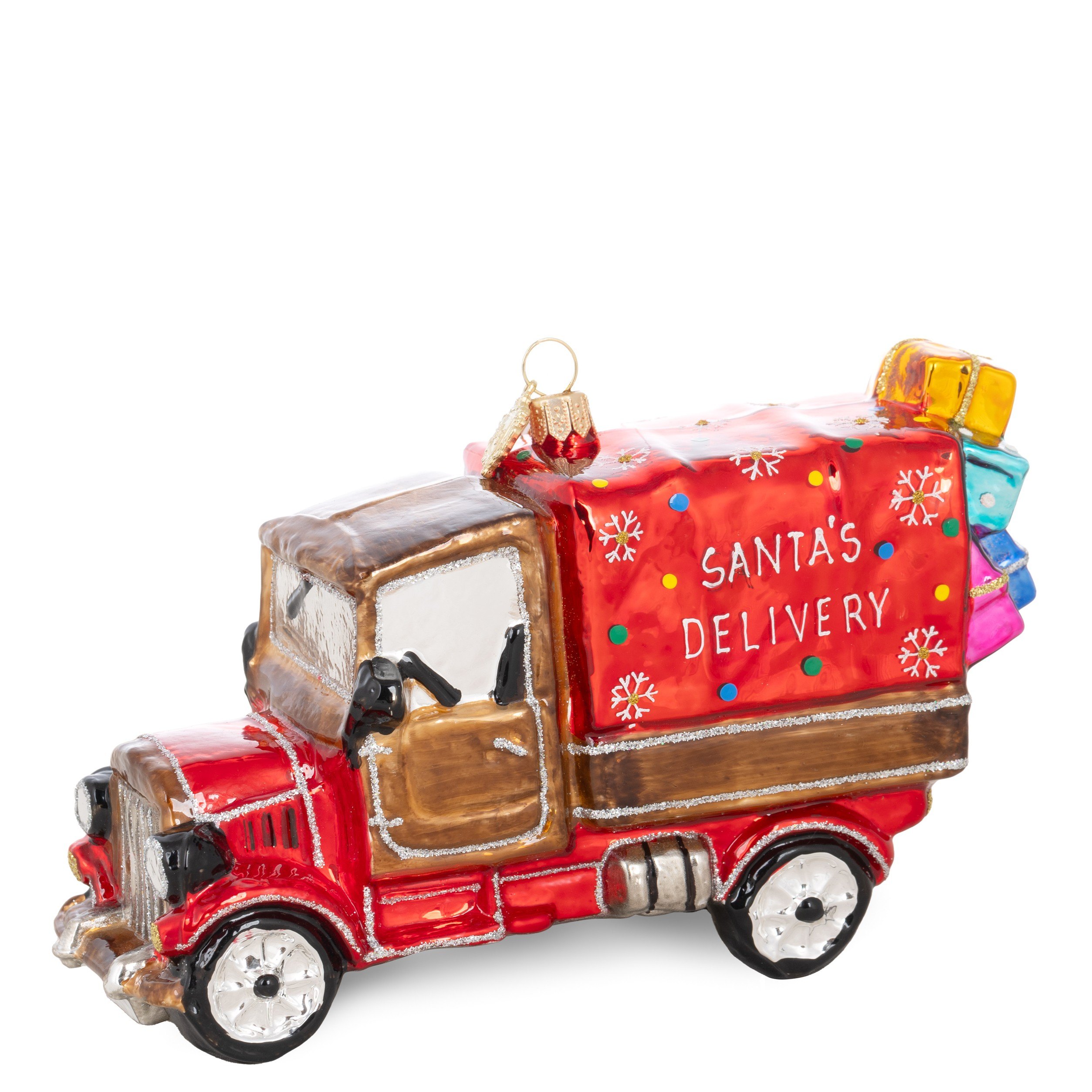 A Christmas ornament in the shape of a Santa’s truck. Perfect for those who love unique Christmas decorations.