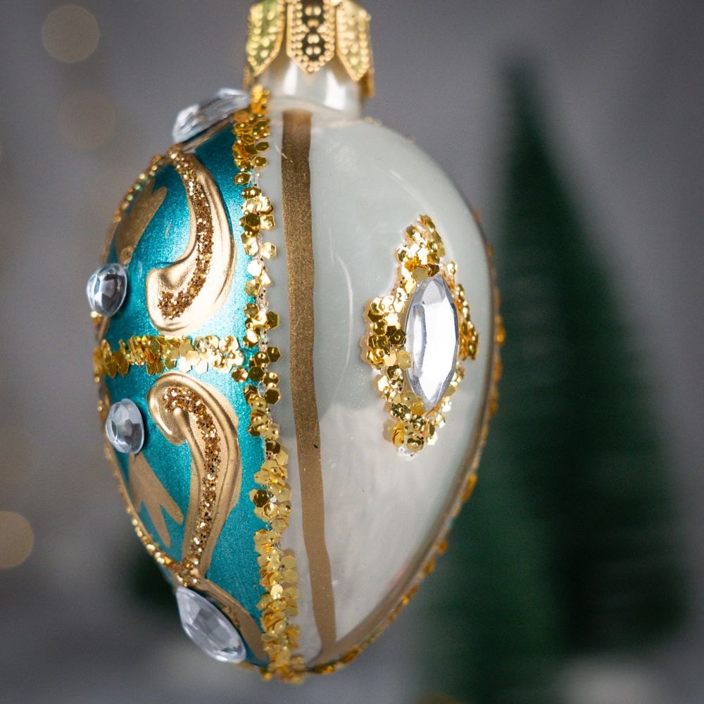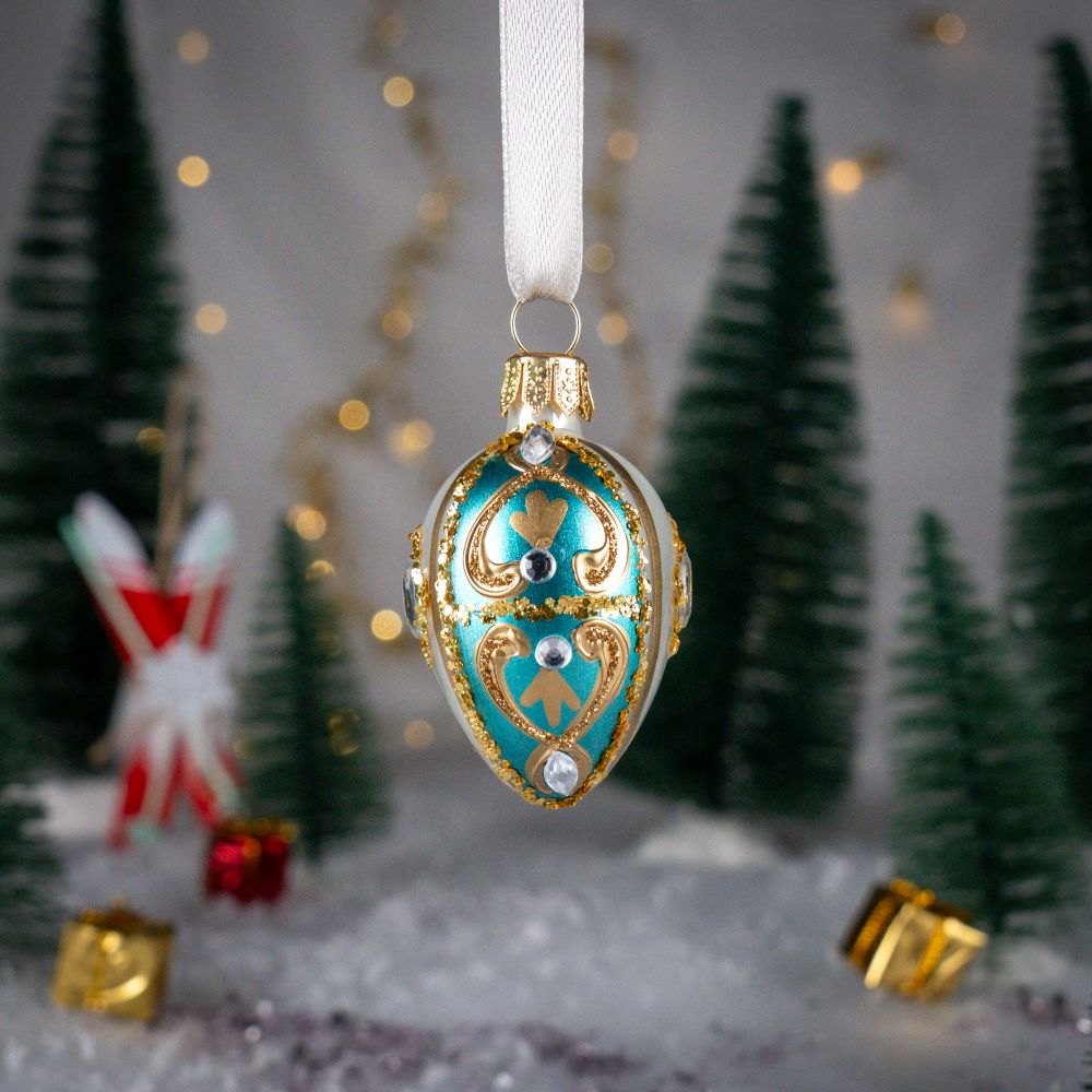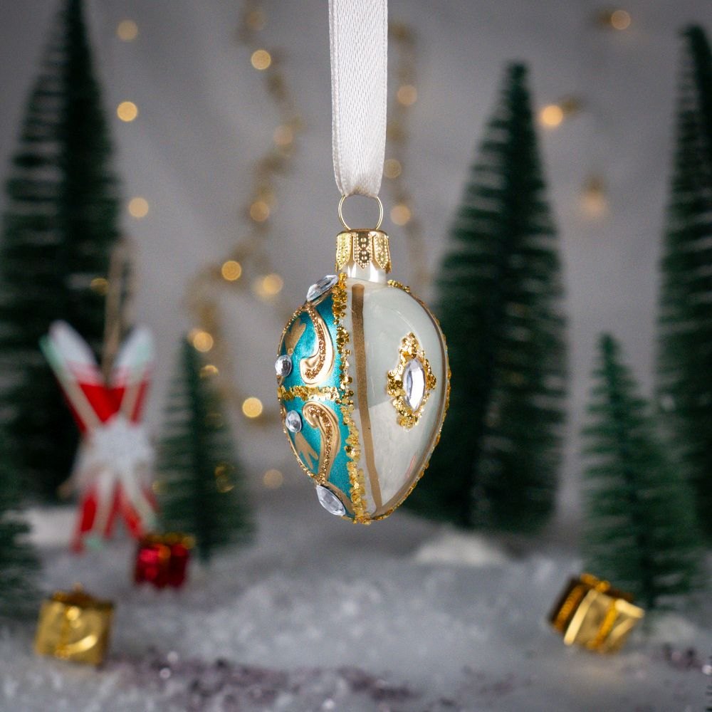 A mini glass bauble in the shape of an oval egg made by Polish artists. With its rich ornamentation it refers to the tsarist style popular in Russia. It is a jewelery work with precision down to the smallest details. The style of Fabergé eggs is the inspiration for creating patterns in this collection.