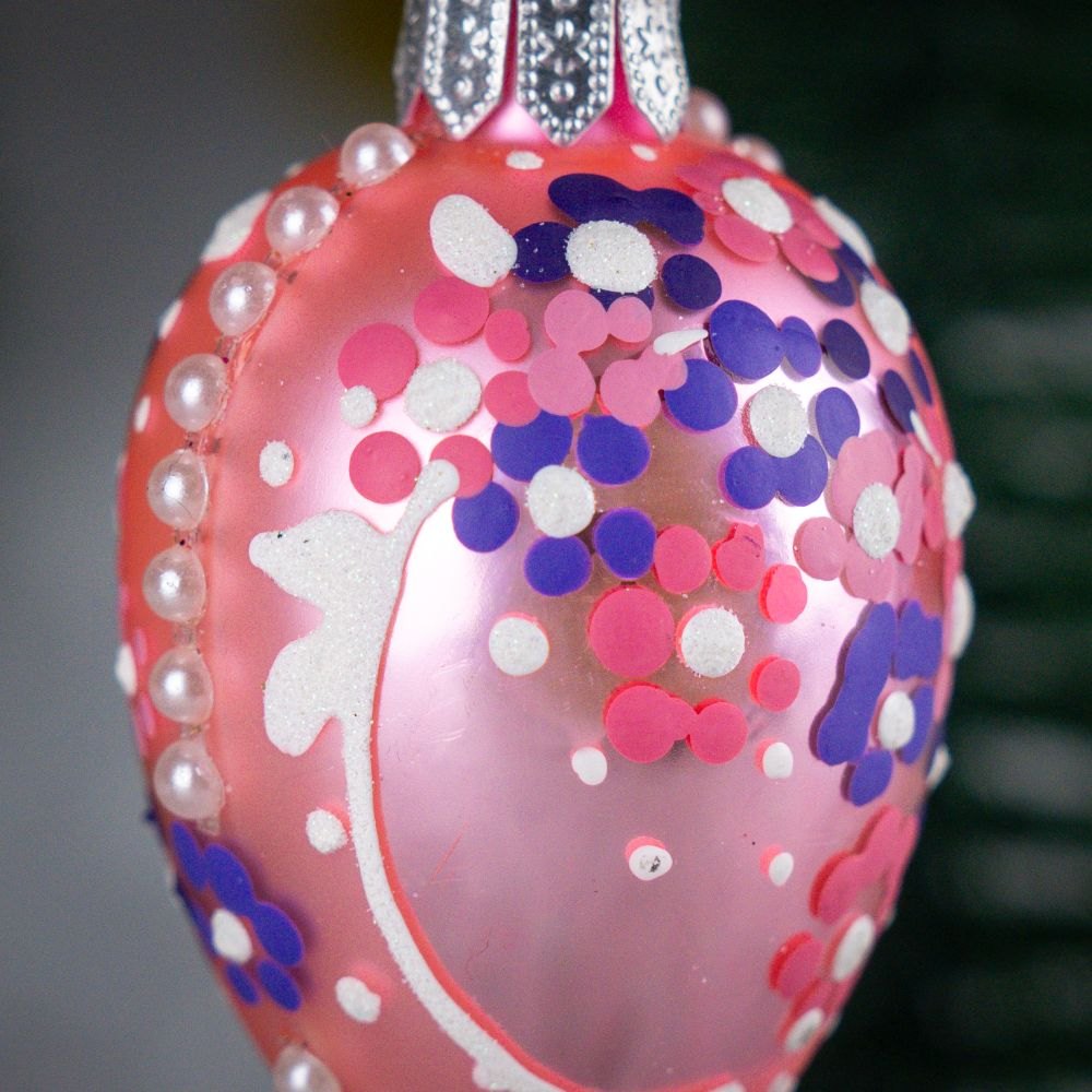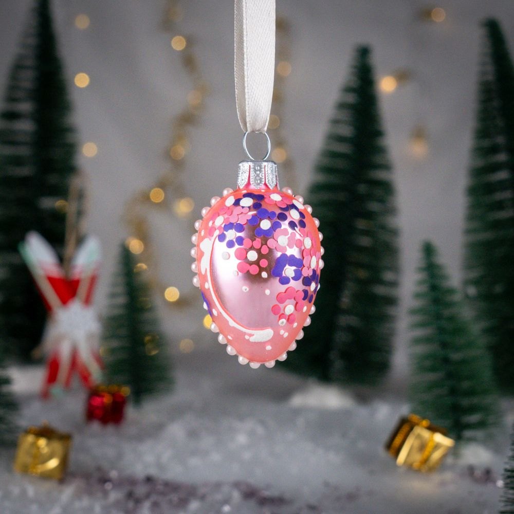 A mini glass bauble in the shape of an oval egg made by Polish artists. With its rich ornamentation it refers to the tsarist style popular in Russia. It is a jewelery work with precision down to the smallest details. The style of Fabergé eggs is the inspiration for creating patterns in this collection.