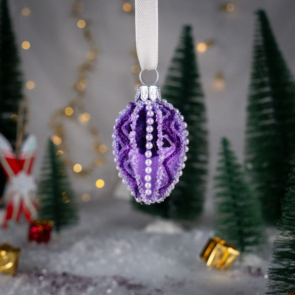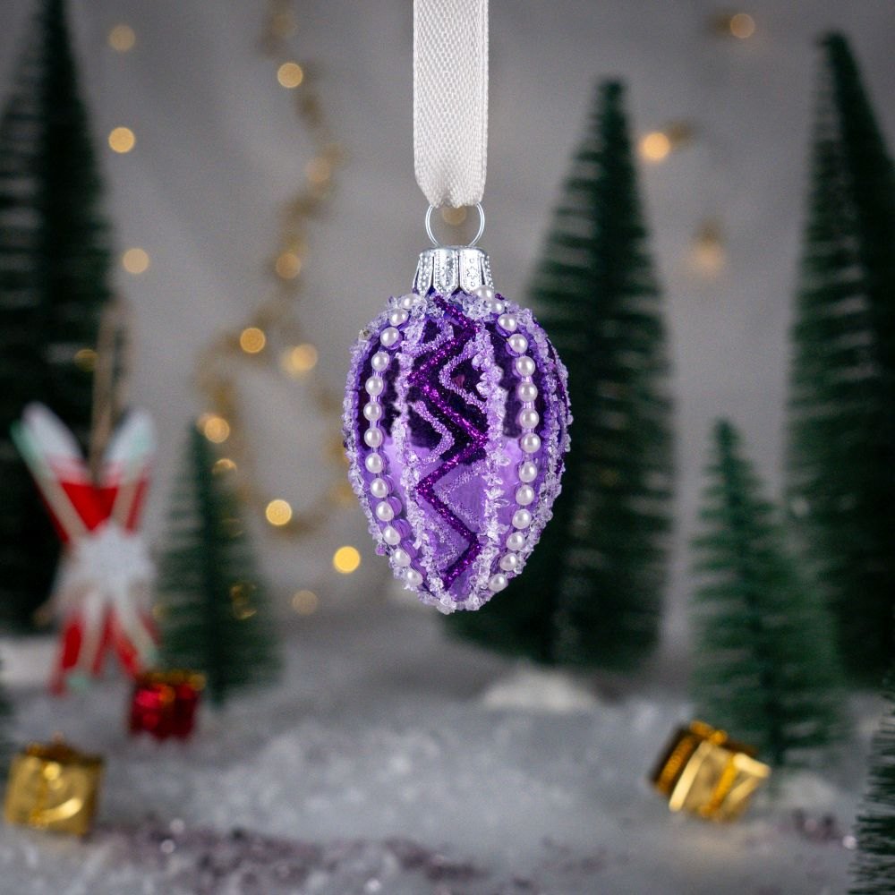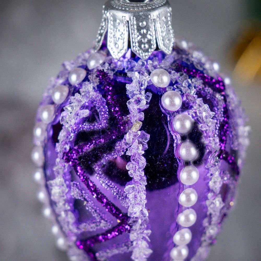 A mini glass bauble in the shape of an oval egg made by Polish artists. With its rich ornamentation it refers to the tsarist style popular in Russia. It is a jewelery work with precision down to the smallest details. The style of Fabergé eggs is the inspiration for creating patterns in this collection.
