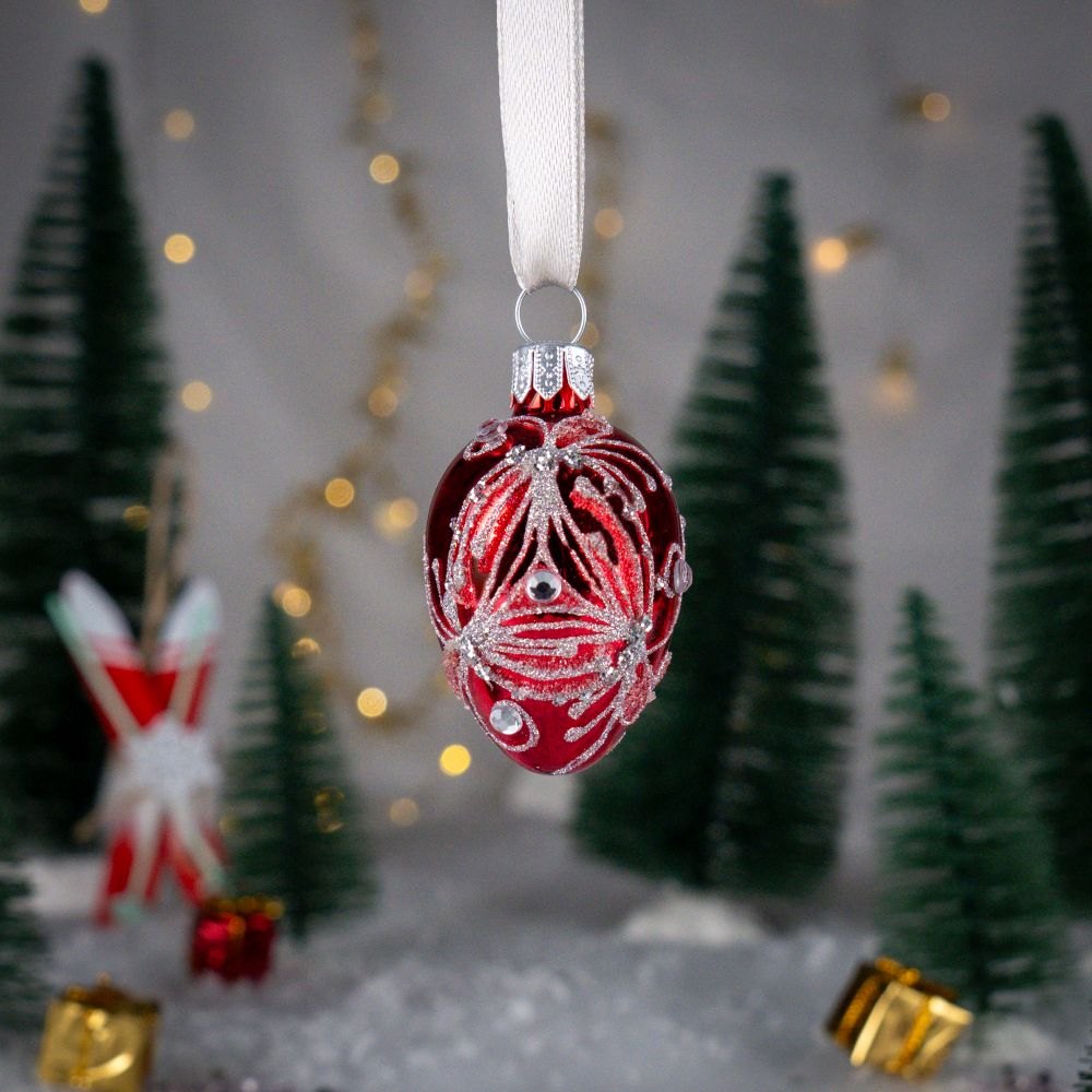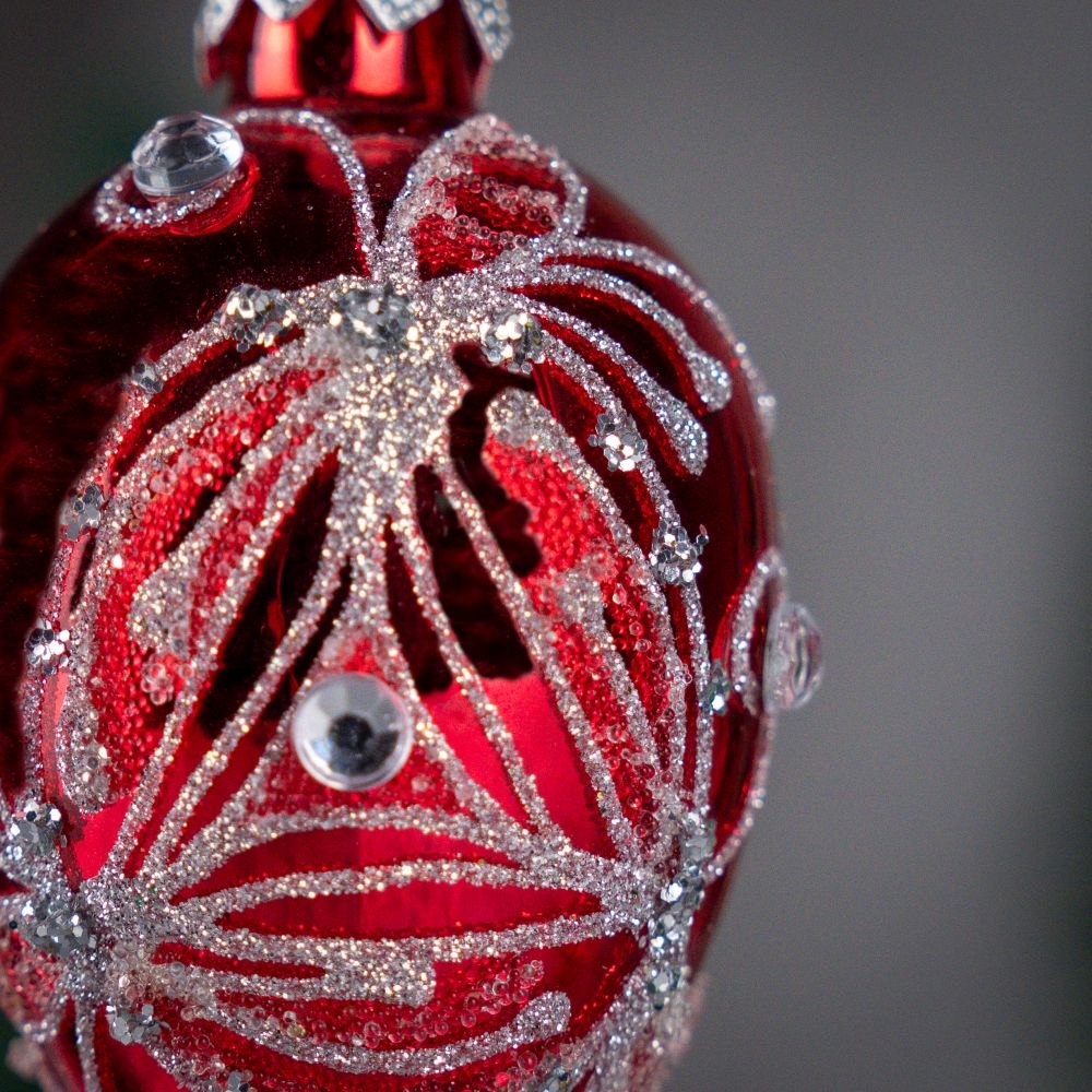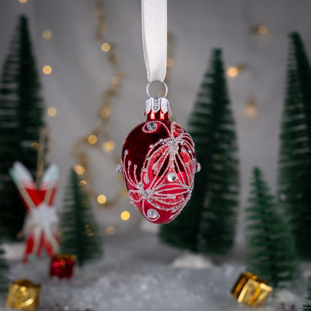 A mini glass bauble in the shape of an oval egg made by Polish artists. With its rich ornamentation it refers to the tsarist style popular in Russia. It is a jewelery work with precision down to the smallest details. The style of Fabergé eggs is the inspiration for creating patterns in this collection.