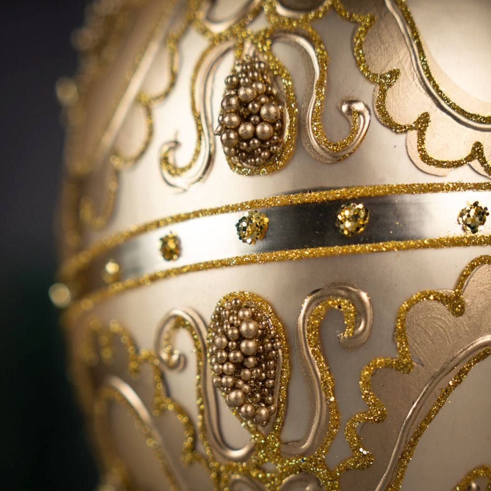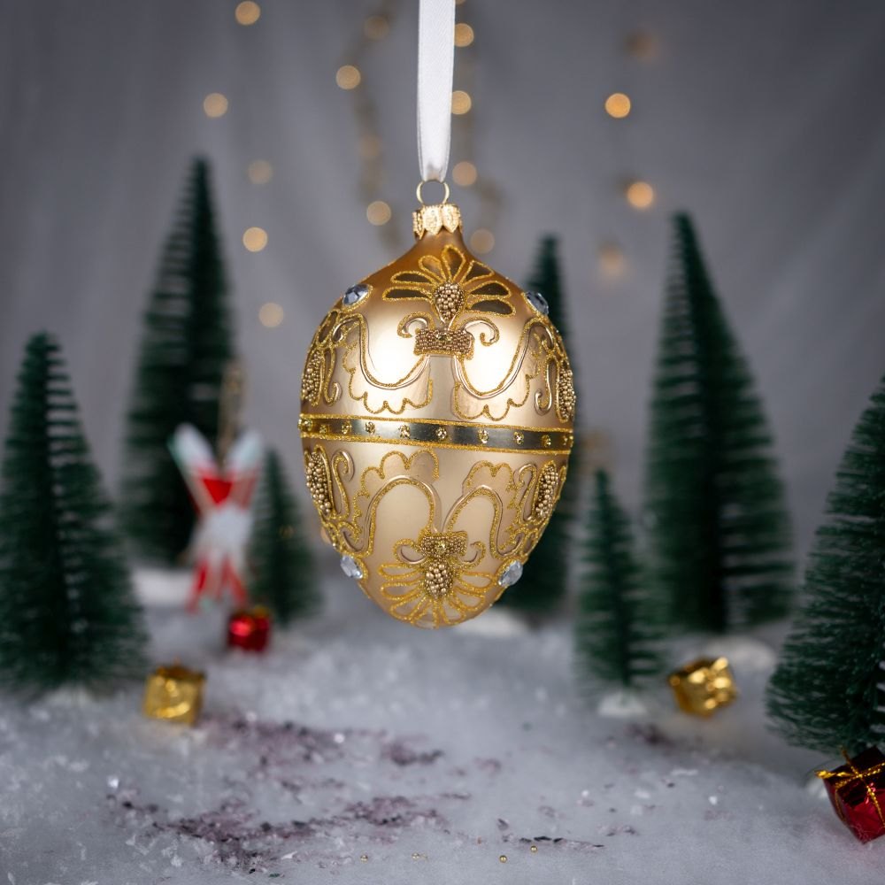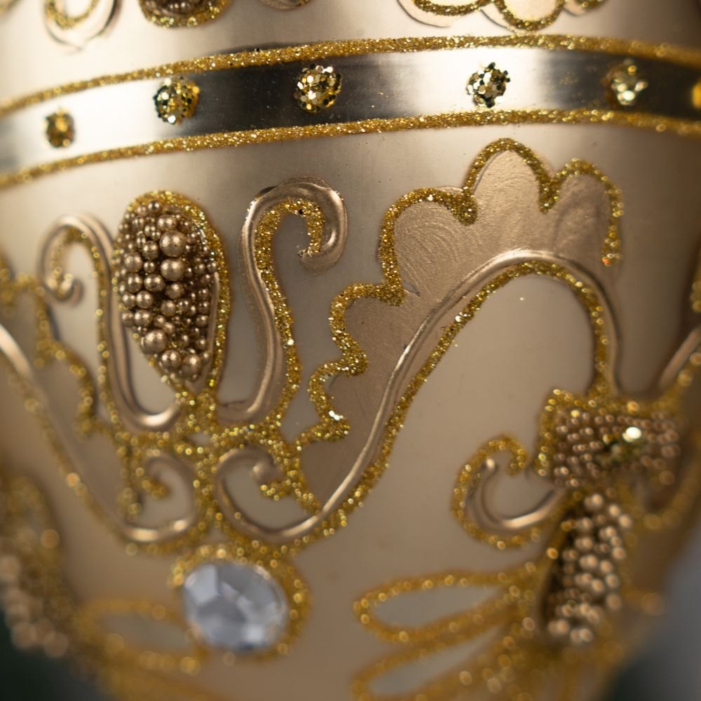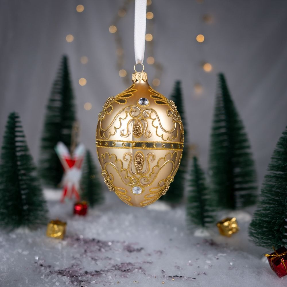 This elegant golden egg-shaped ornament is the essence of holiday luxury. Its satin surface softly reflects the light, creating a warm and refined glow. The entire ornament is adorned with an intricate pattern made of tiny beads and gold glitter, arranged into classic, symmetrical motifs reminiscent of palace decorations. Sparkling crystals placed along the sides add a jewelry-like brilliance and enhance the ornament’s sophisticated depth.
