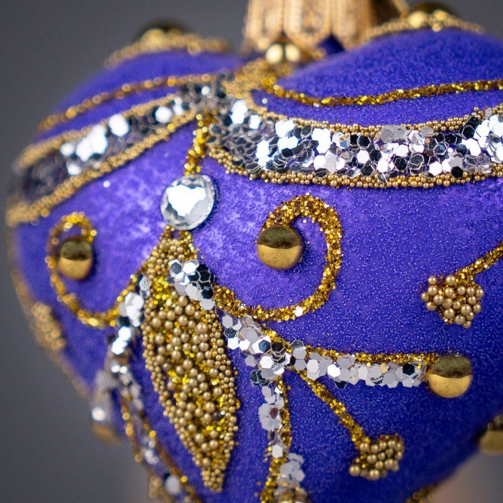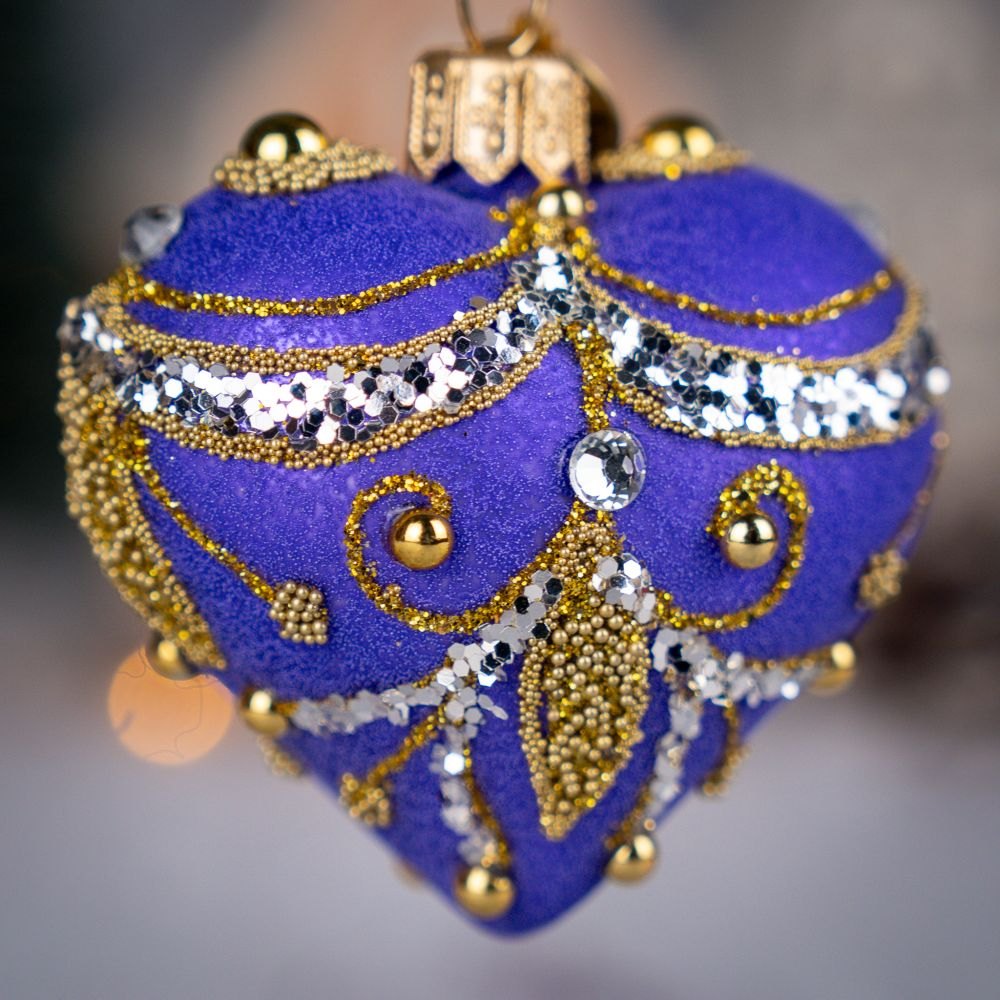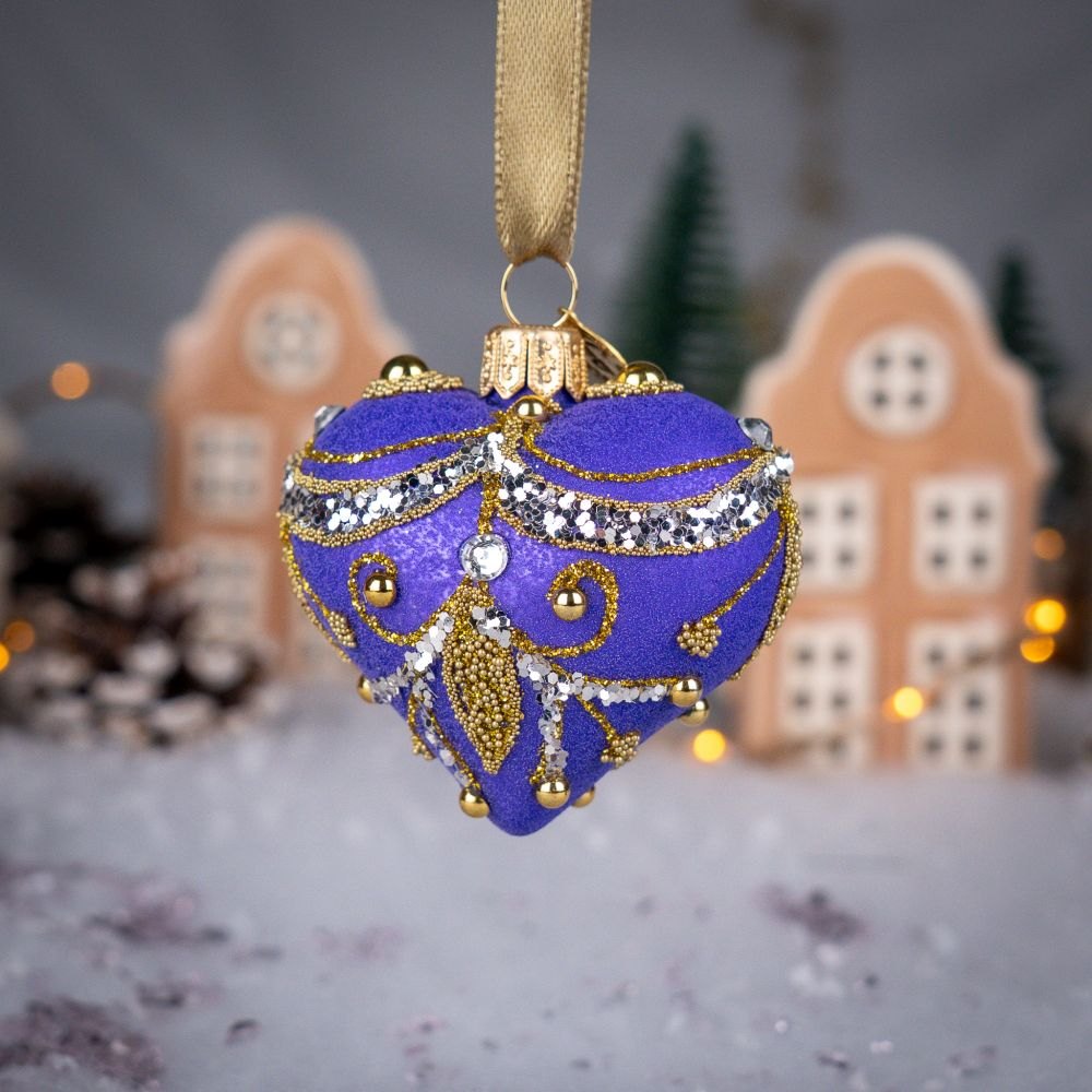 This exquisite heart-shaped ornament dazzles with its rich amethyst color, giving it an elegant and distinctly jewel-like character. The matte, velvety surface contrasts beautifully with the golden ornaments cascading from the top like shimmering streams. The decoration is crafted from tiny beads, glitter, and sparkling crystals — including a larger teardrop-shaped gem that subtly catches the light.