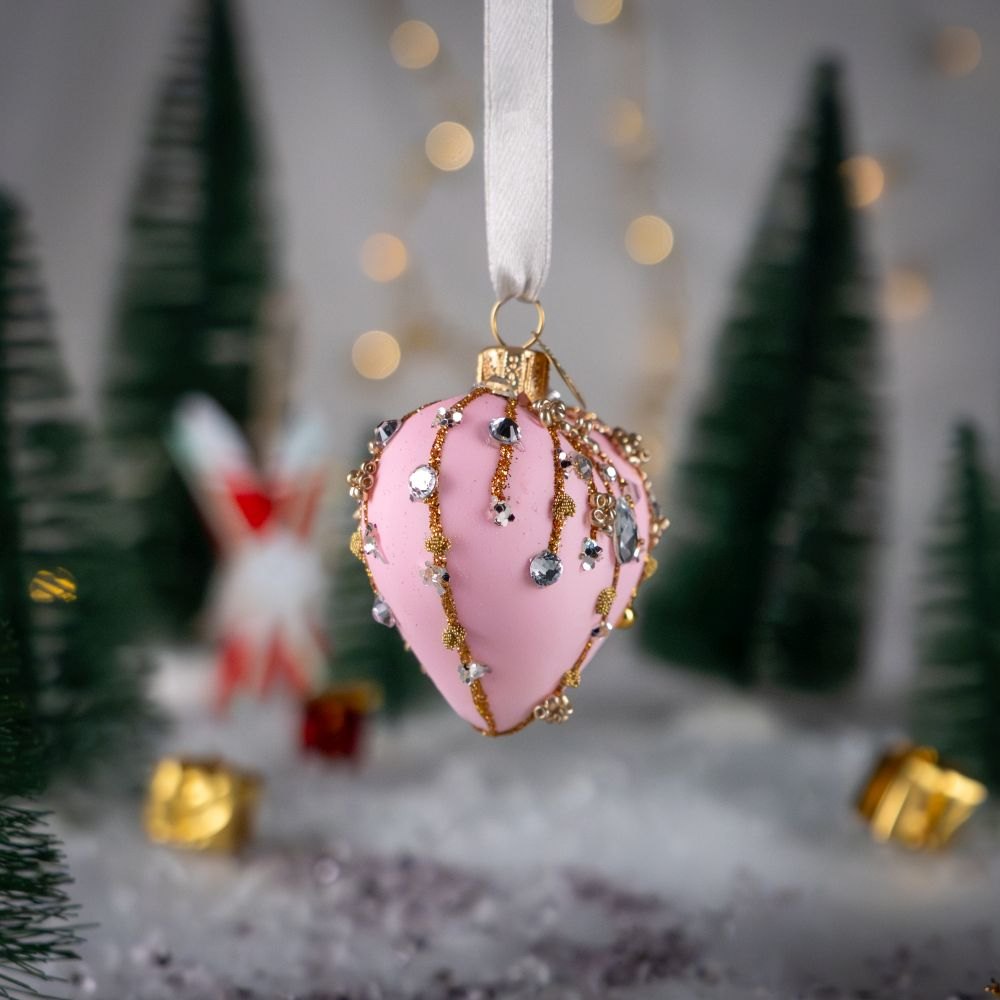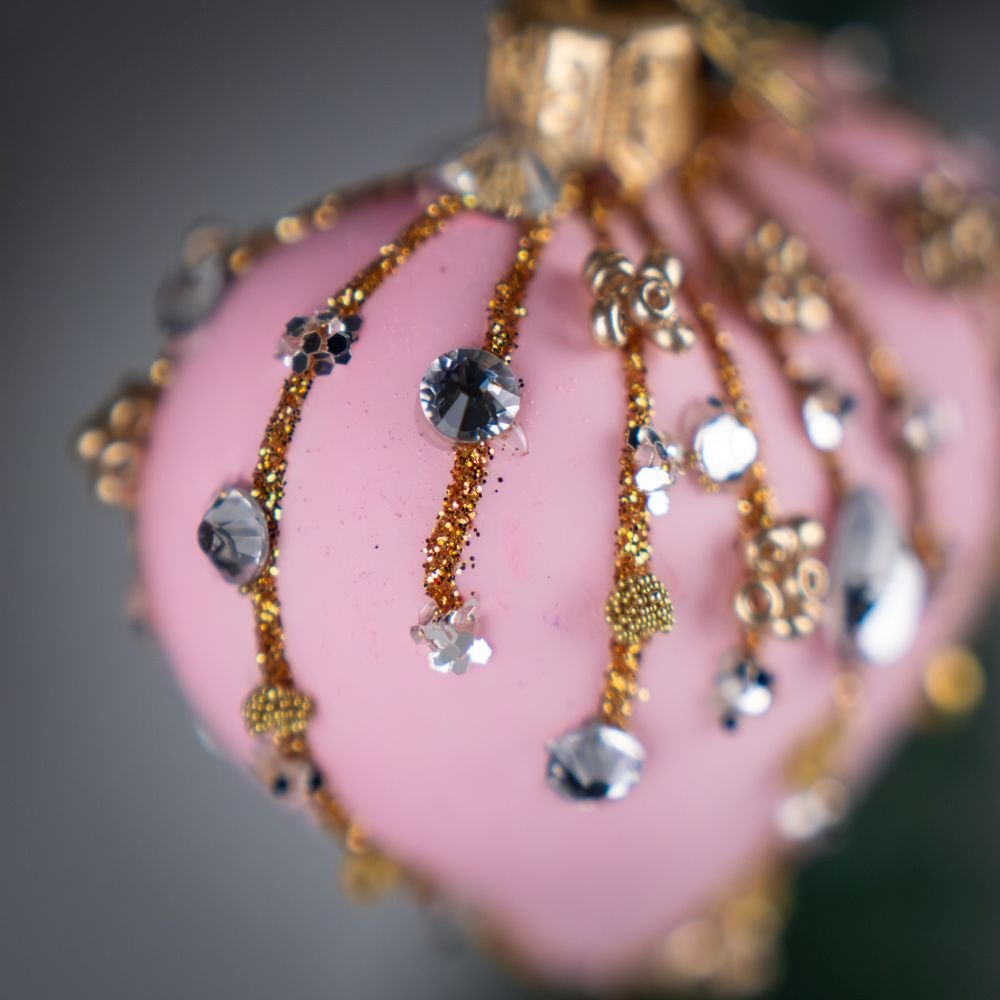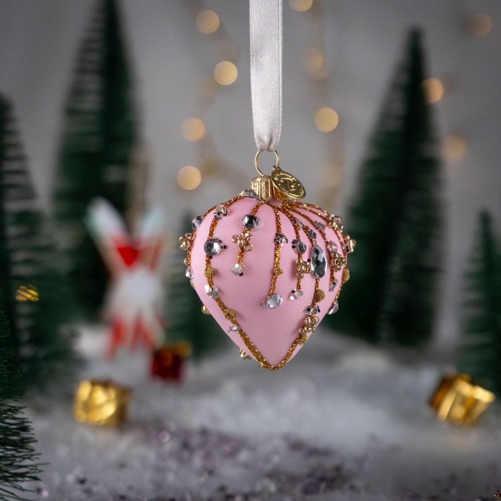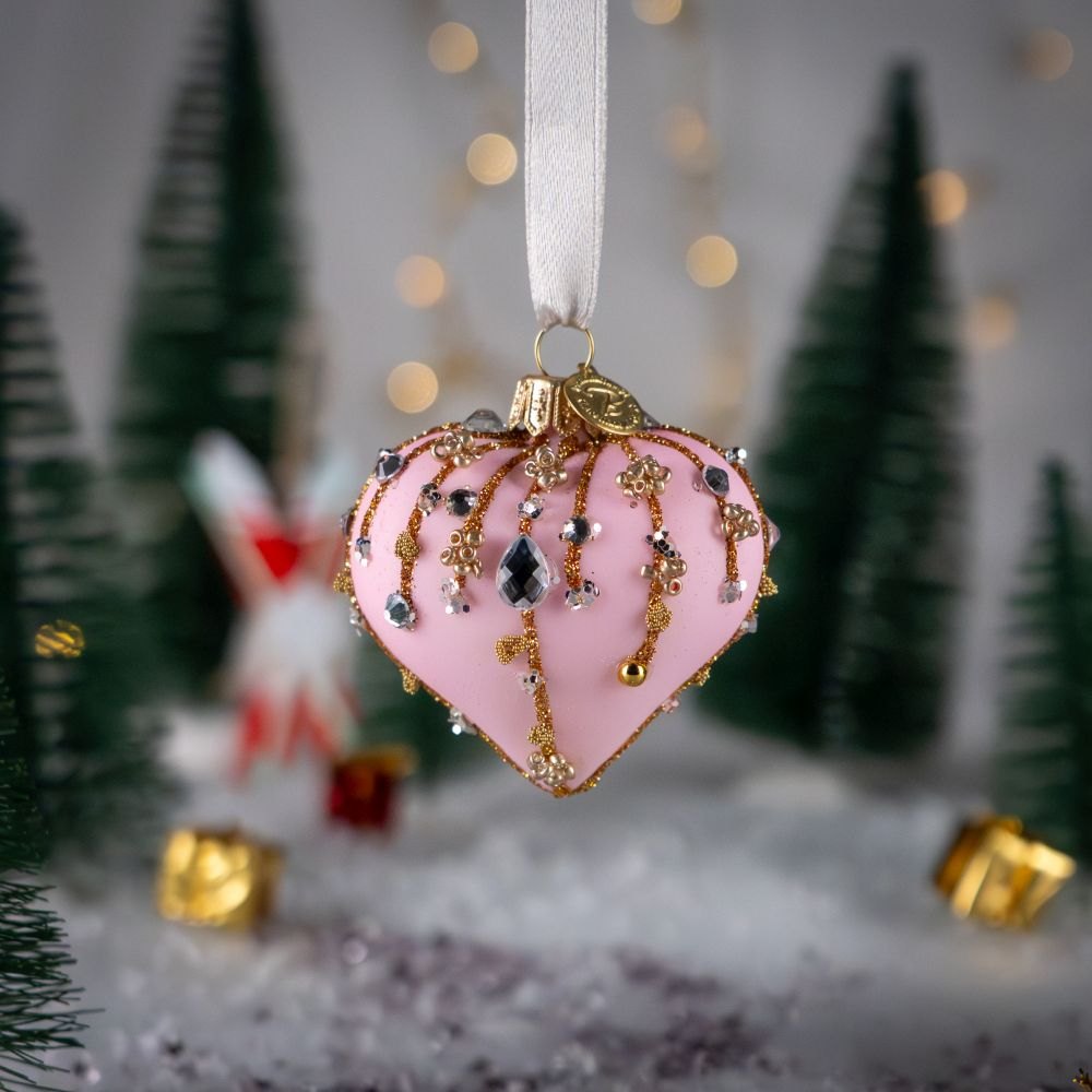 This charming heart-shaped ornament delights with its soft, powder-pink color that gives it a touch of delicacy and romantic charm. On its silky matte surface cascade golden ornaments adorned with tiny beads, glitter, and shimmering crystals. Among them are larger faceted gems that catch the light like little holiday jewels. A golden cap and elegant cream ribbon complete the look, highlighting the ornament’s refined, jewelry-like character.