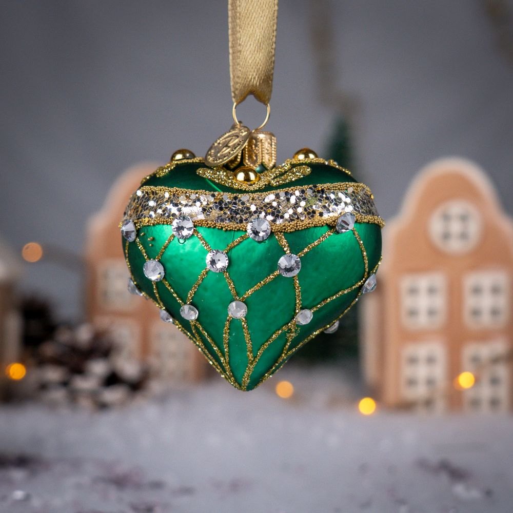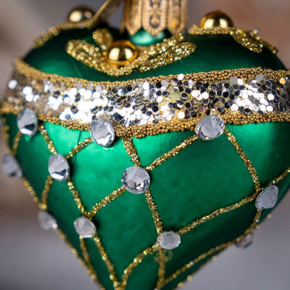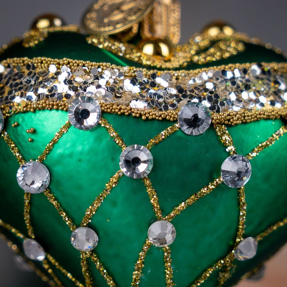 This exquisite heart-shaped ornament dazzles with its rich green color, giving it an elegant and distinctly jewel-like character. The matte velvety surface contrasts beautifully with the golden ornaments cascading from the top like shimmering streams. The decoration is crafted from tiny beads, glitter, and sparkling crystals — including a larger teardrop-shaped gem that subtly catches the light.