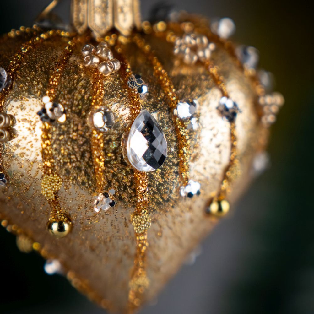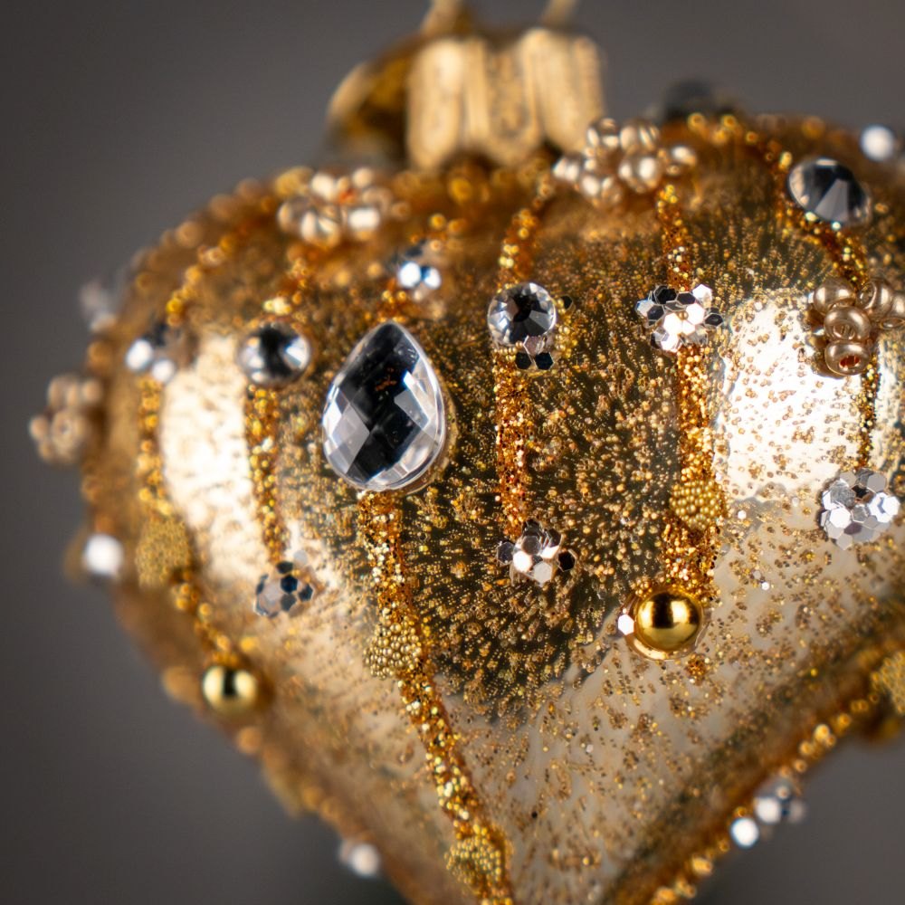 This exquisite heart-shaped ornament is the essence of holiday luxury. Its surface shimmers with rich golden tones, creating the effect of a radiant, jewelry-like decoration. The entire piece is adorned with fine glitter details forming cascading golden streams, interwoven with tiny beads and sparkling crystals and faceted gems that beautifully reflect the light. Every detail is crafted with exceptional precision, making this ornament a true miniature work of art.
