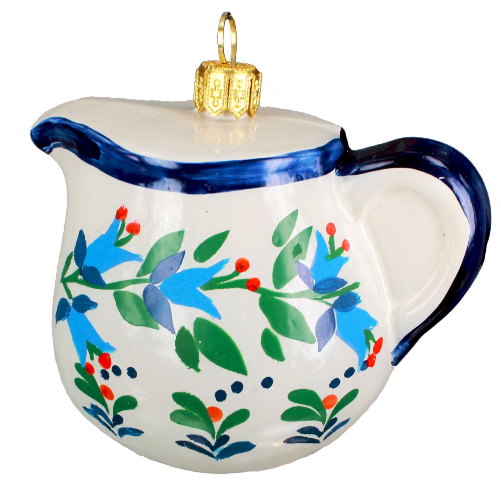 Glass, mouth-blown and hand-painted, white milk jug, decorated with a motif of green sprouts with blue bells. This ornament belongs to Bombkarnia’s Pottery Collection, inspired by polish pottery from Manufactory in Boleslawiec.