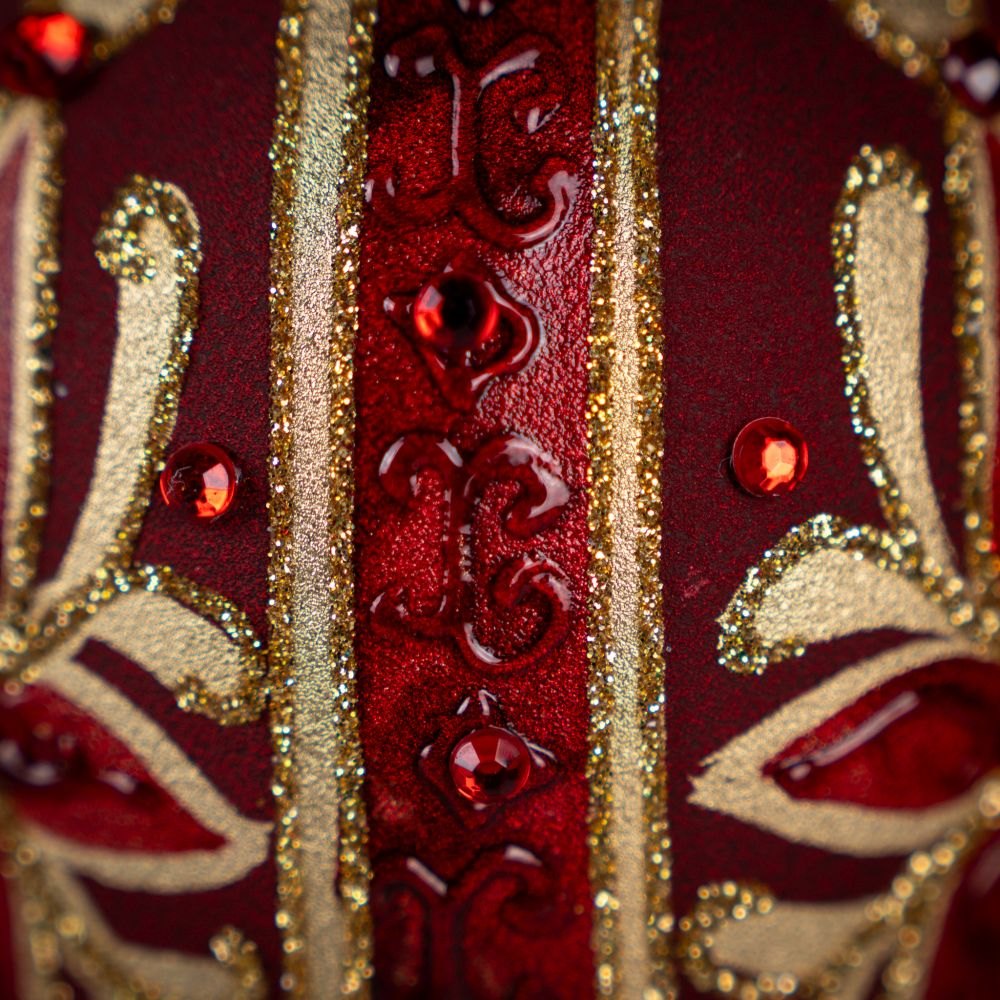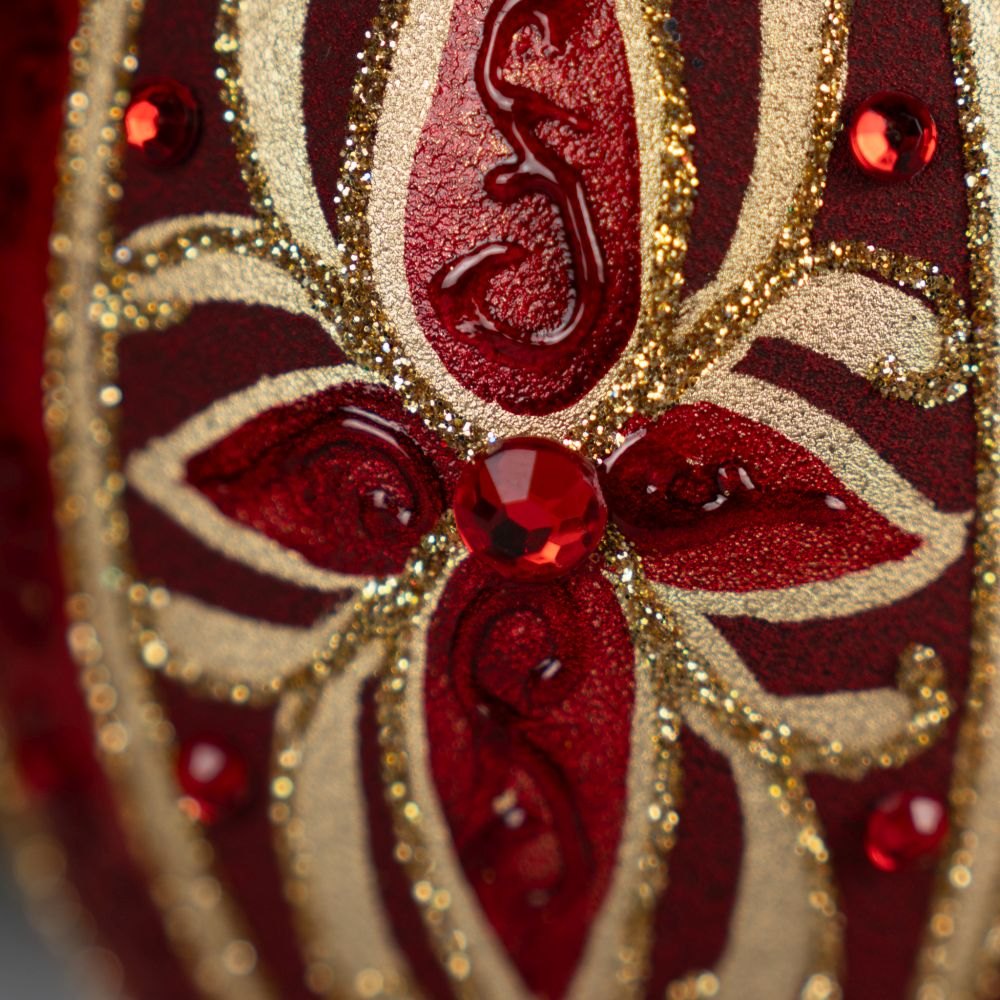 This elegant egg-shaped ornament enchants with its deep red color paired with golden detailing, creating a luxurious and festive look. On its matte surface blooms an intricate ornament resembling a flower or star, crafted from glitter and red crystals that beautifully catch the light. Surrounding the central motif are additional embellishments — raised patterns, glitter accents, and shimmering stones — adding depth and uniqueness to the piece.