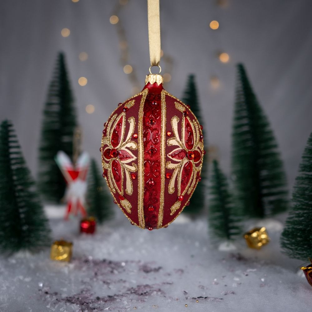 Hung on a golden ribbon, the red egg becomes a striking and refined accent on the Christmas tree. It’s the perfect ornament for those who appreciate traditional holiday colors presented in a luxurious way and value high-quality handcrafted details.