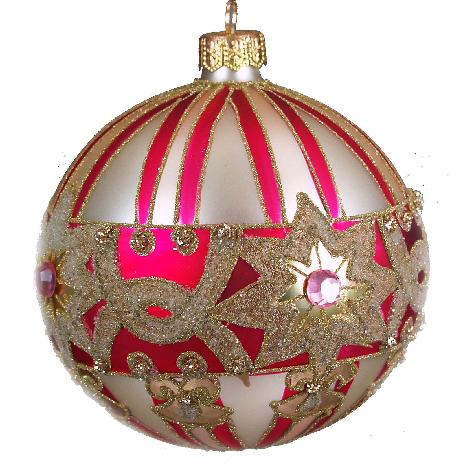 Royal Ornaments – Pink Stripes – Glass, mouth blown and hand-decorated, gold bauble with a splendid ornamental composition.