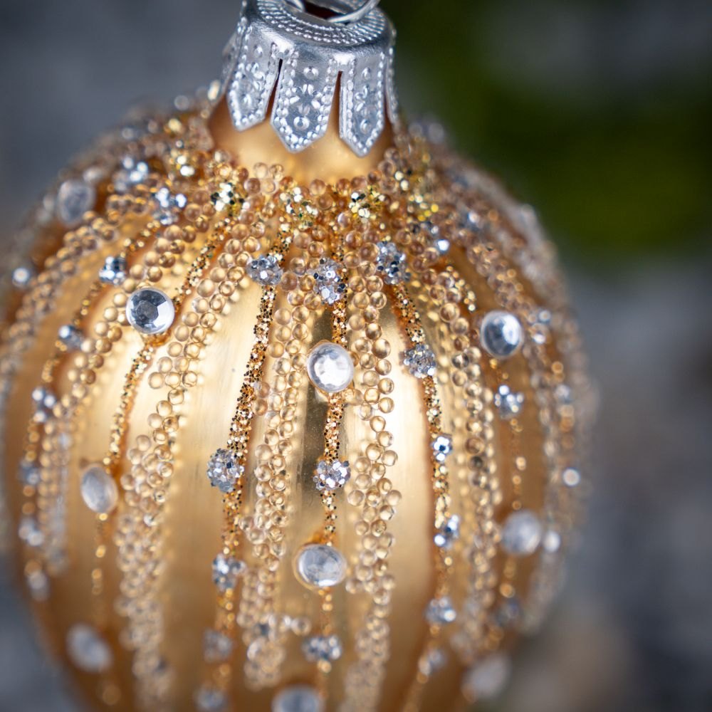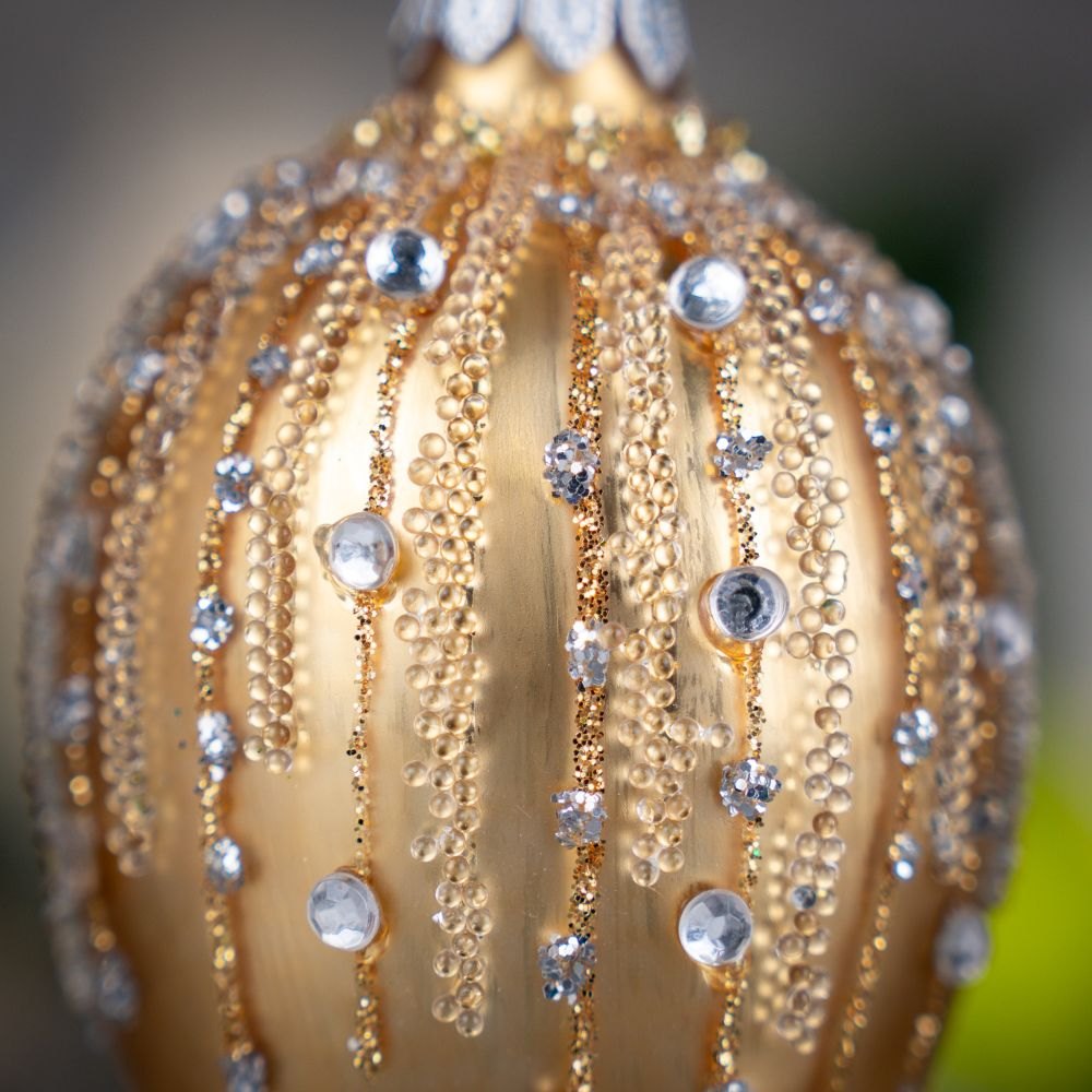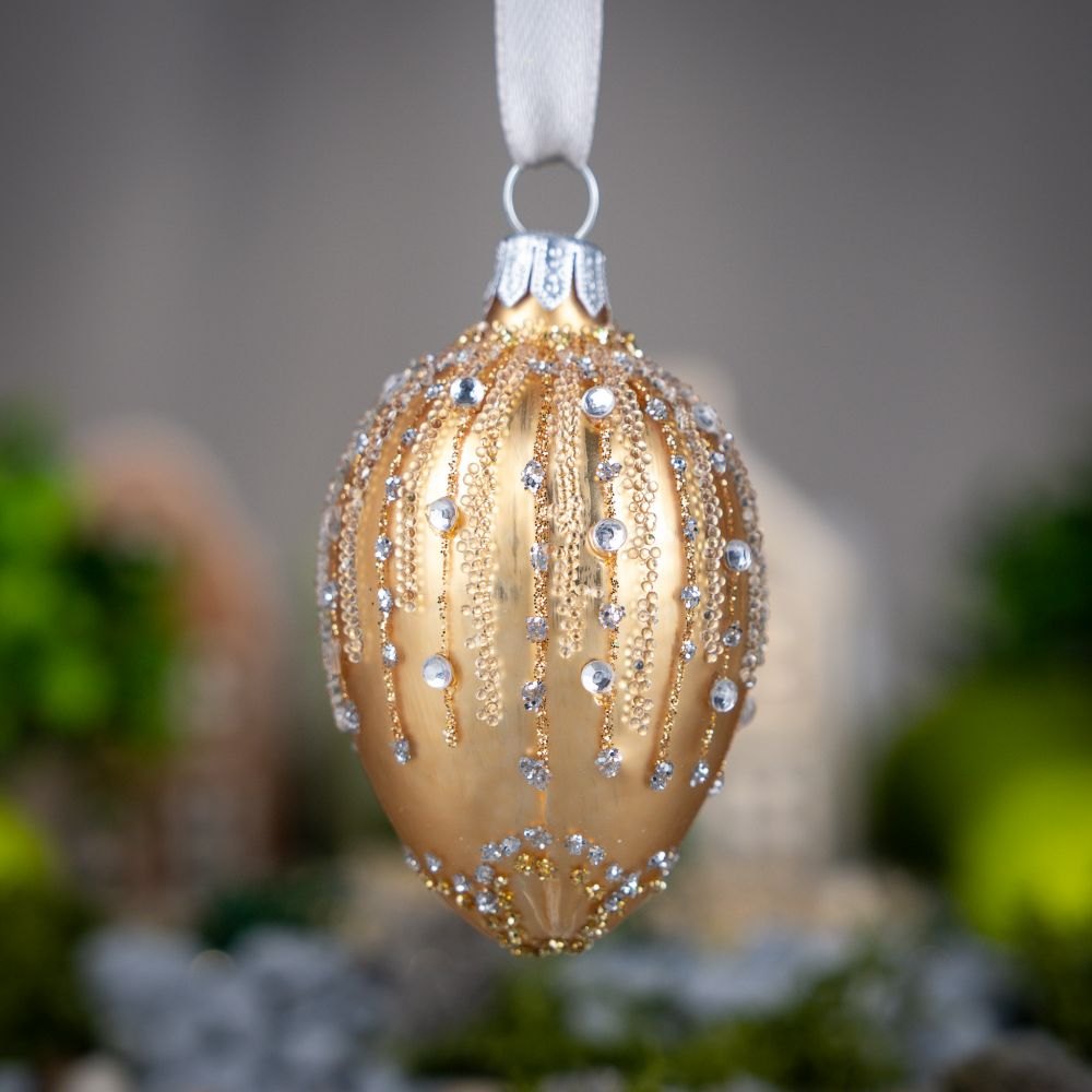 A glass bauble in the shape of an oval egg made by Polish artists. With its rich ornamentation it refers to the tsarist style popular in Russia. It is a jewelery work with precision down to the smallest details. The style of Fabergé eggs is the inspiration for creating patterns in this collection.