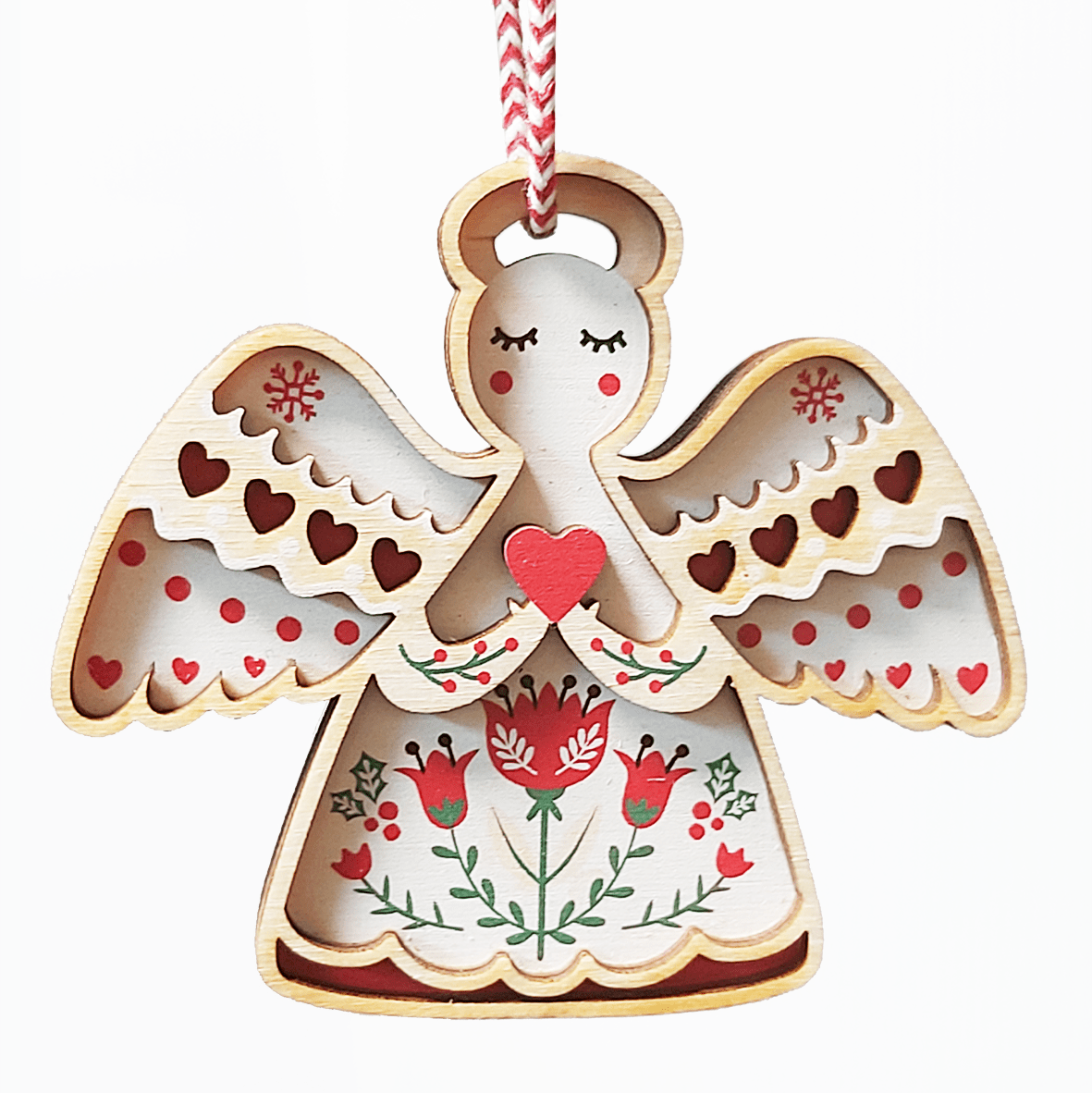 Wooden Christmas ornament in the shape of an angel, hand-painted in Poland.