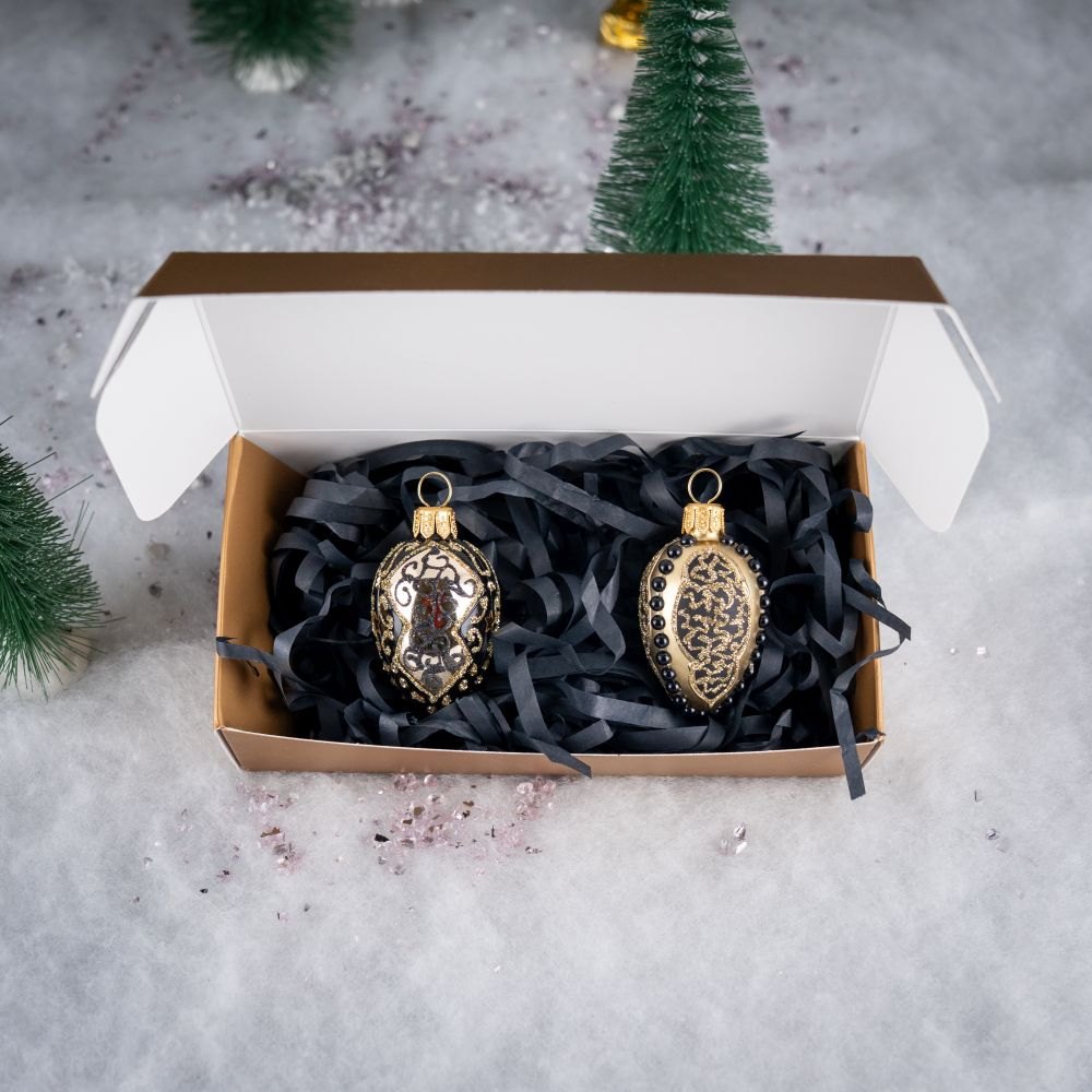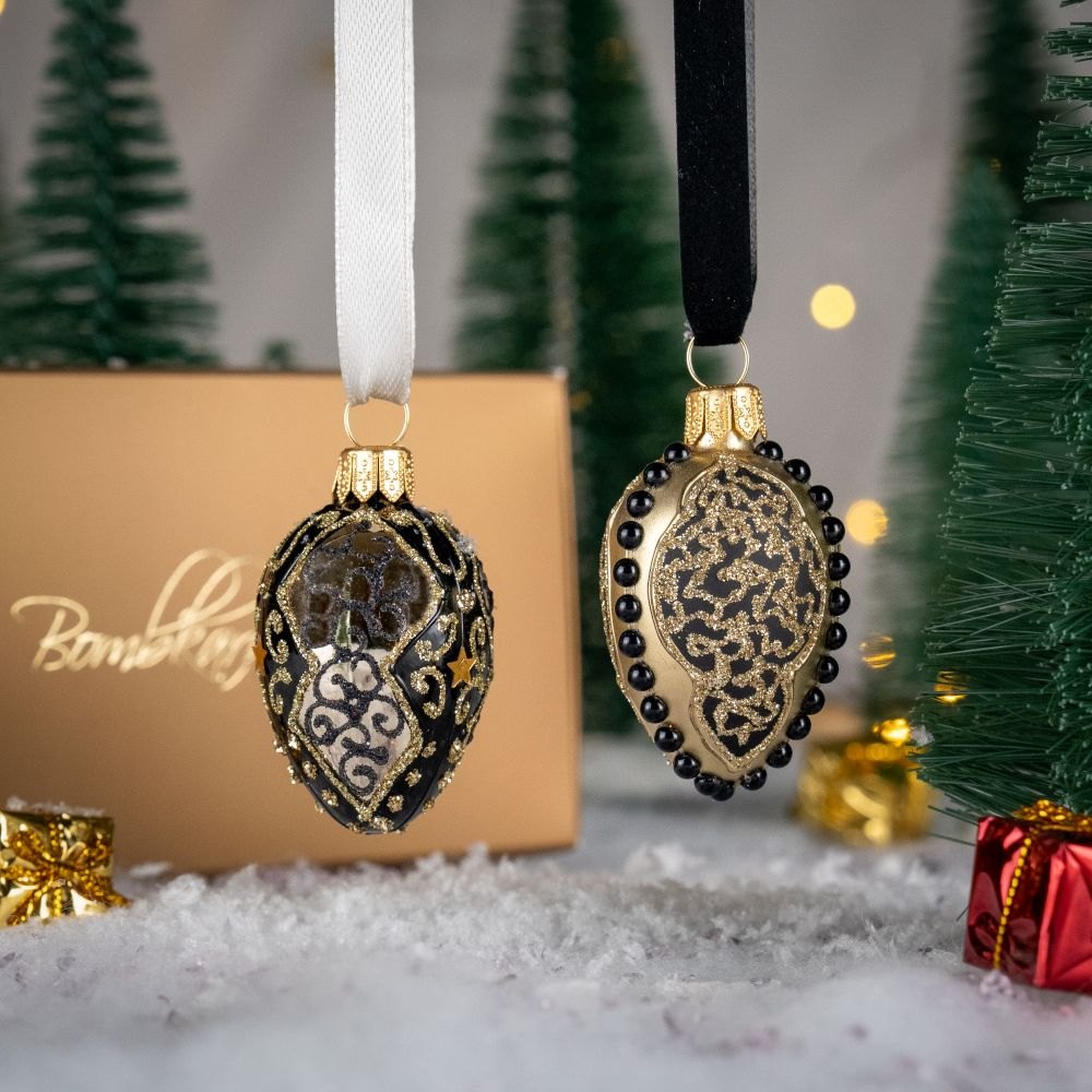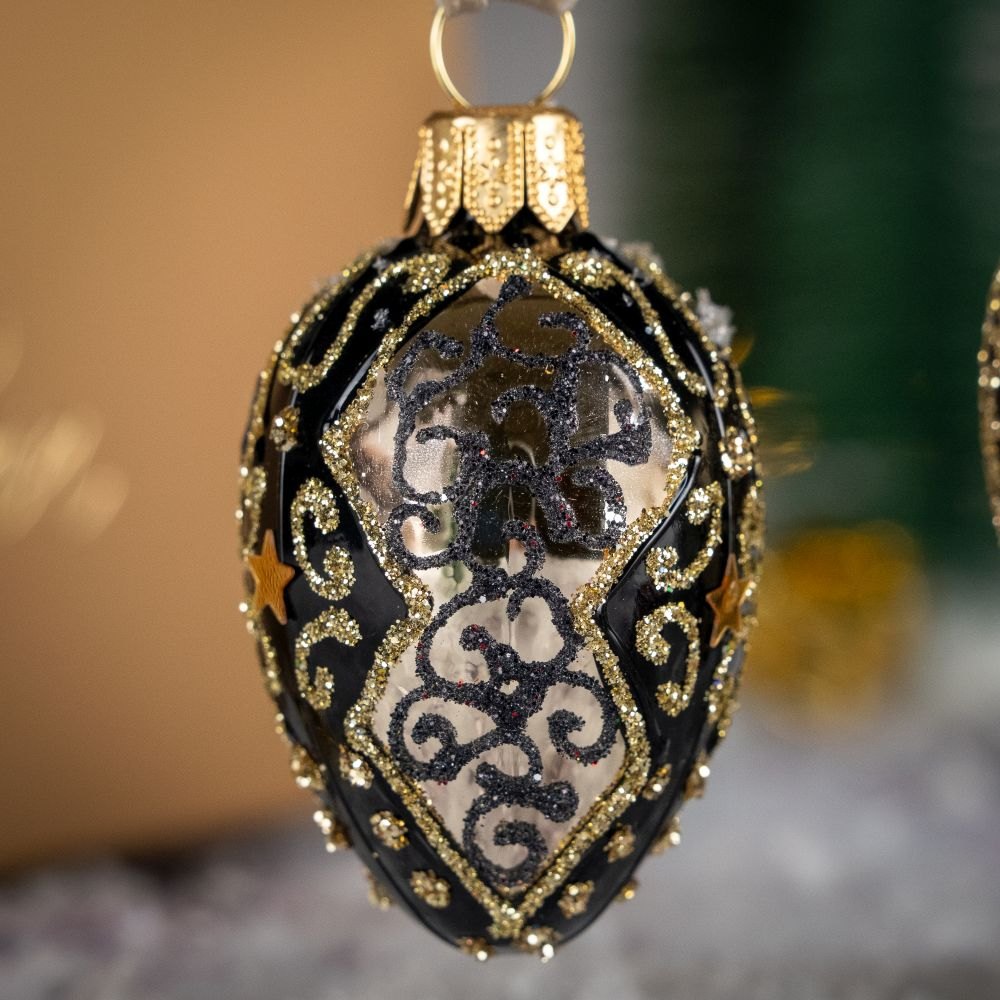 A mini glass bauble in the shape of an oval egg made by Polish artists.