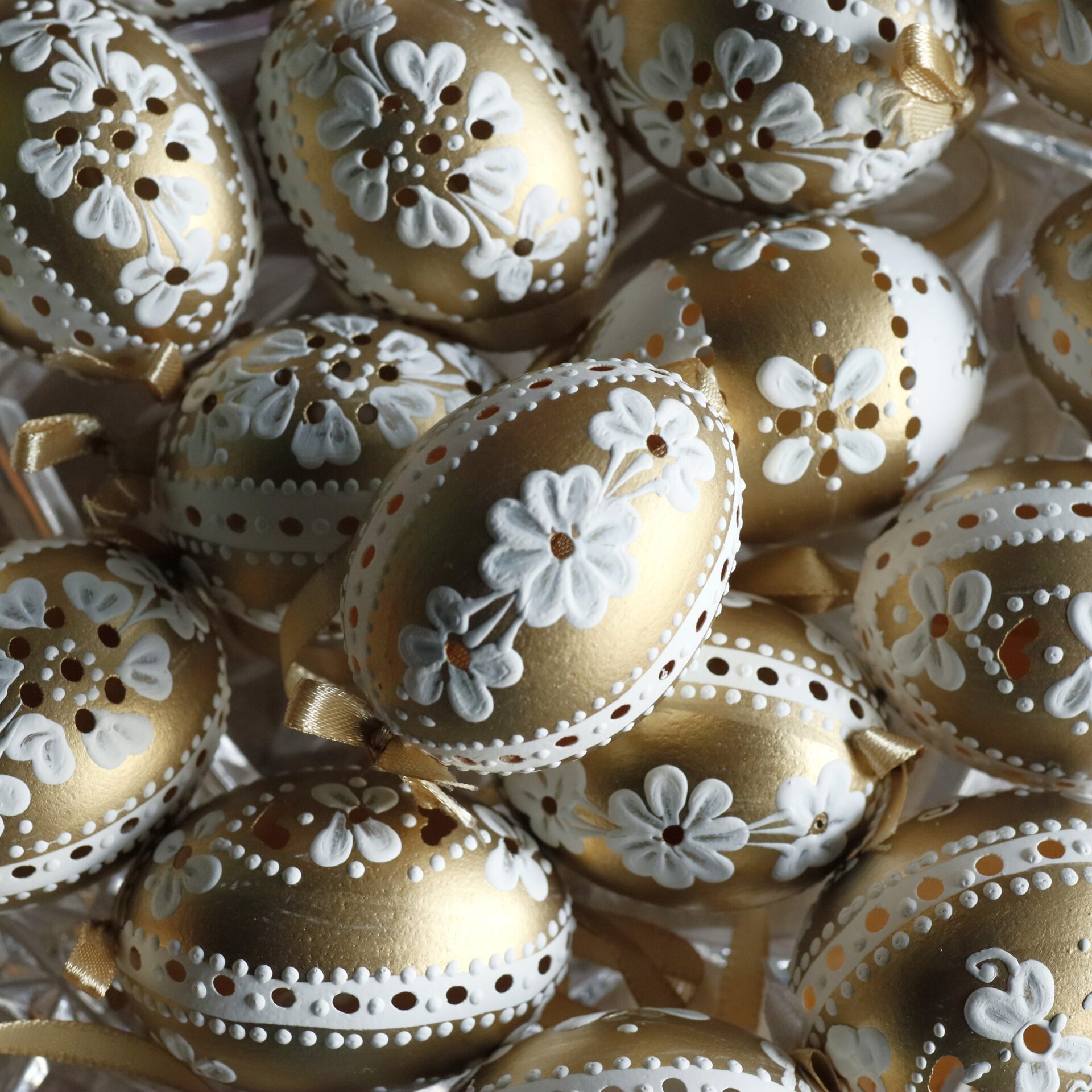 A white openwork Easter egg decorated with an elaborate, openwork pattern. To facilitate the creation of spring decorations, the shell is hung on a ribbon.