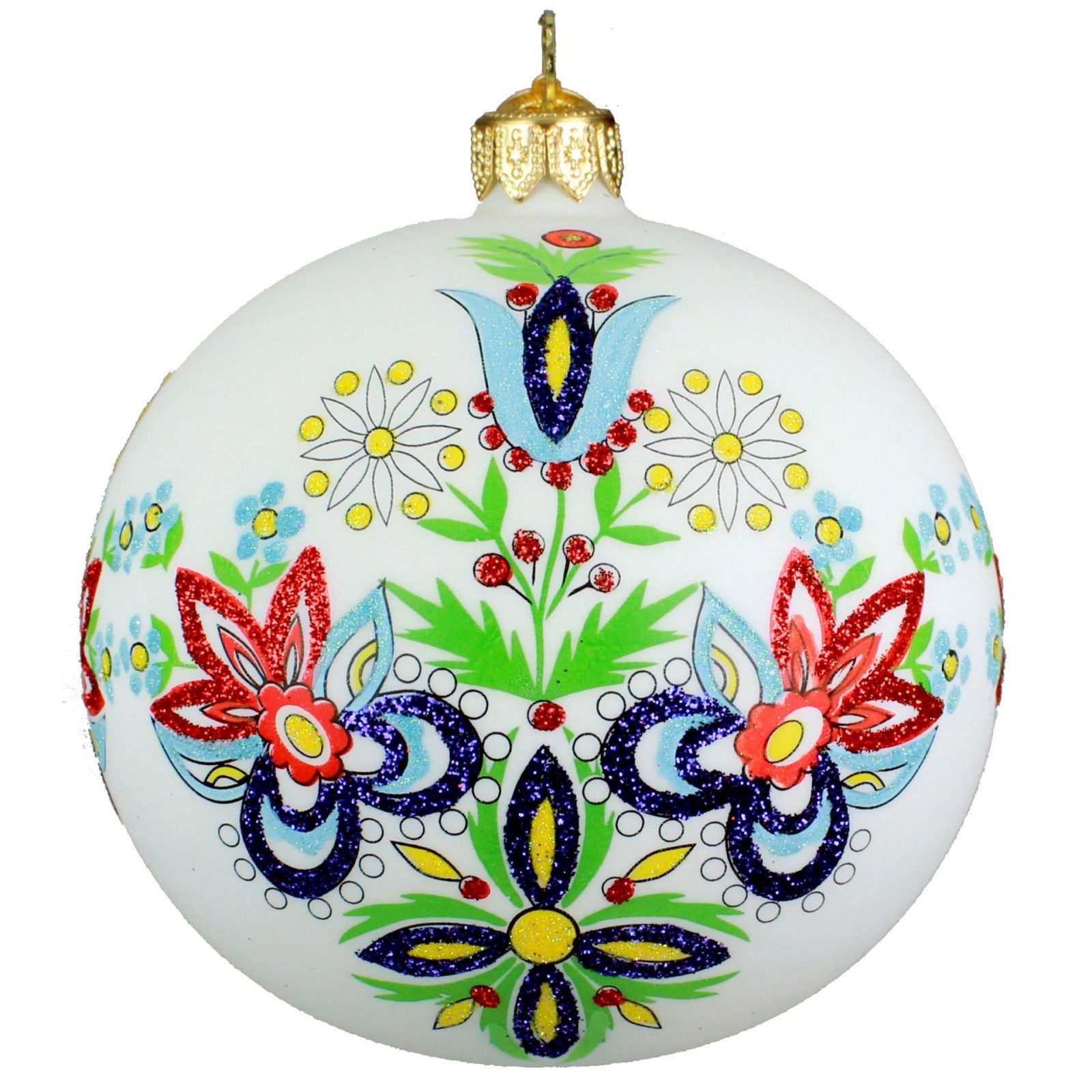 Szklana, ręcznie dekorowana, biała bombka z motywem pęku kaszubskich kwiatów, przyprószonych granatowym brokatem.