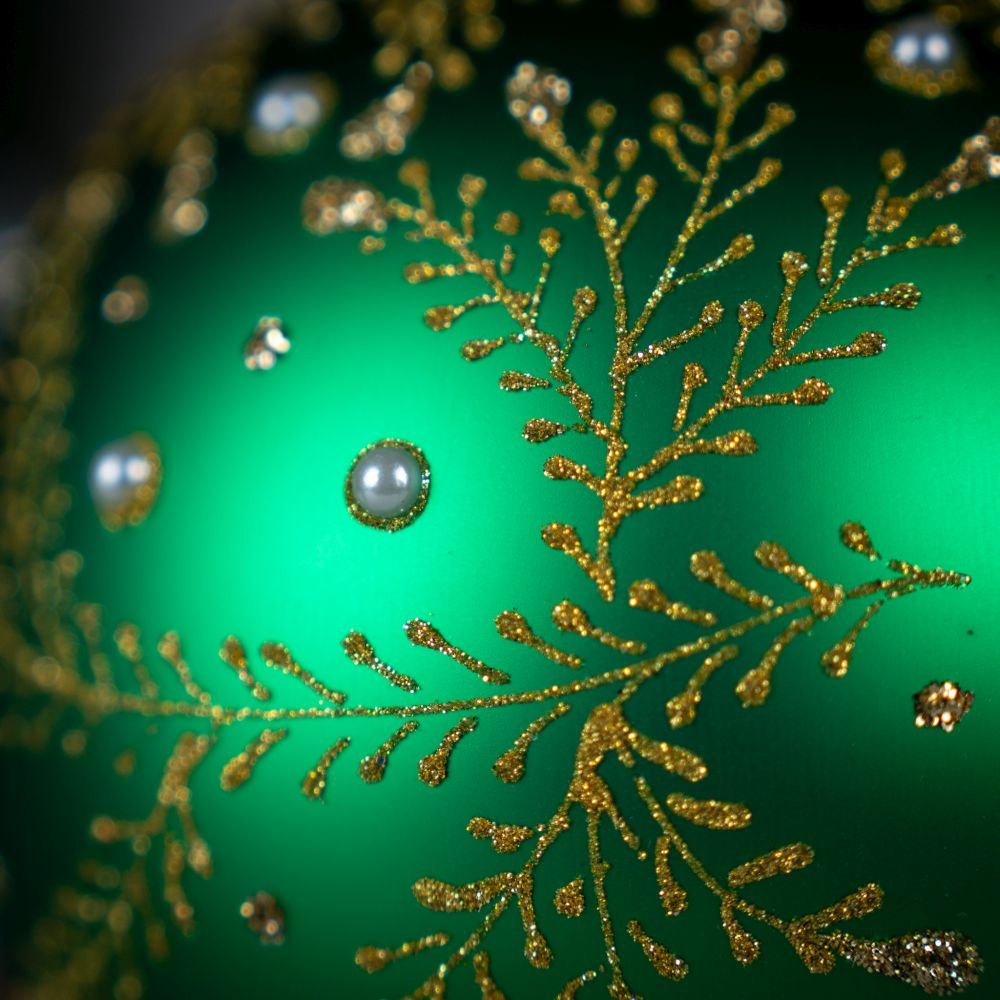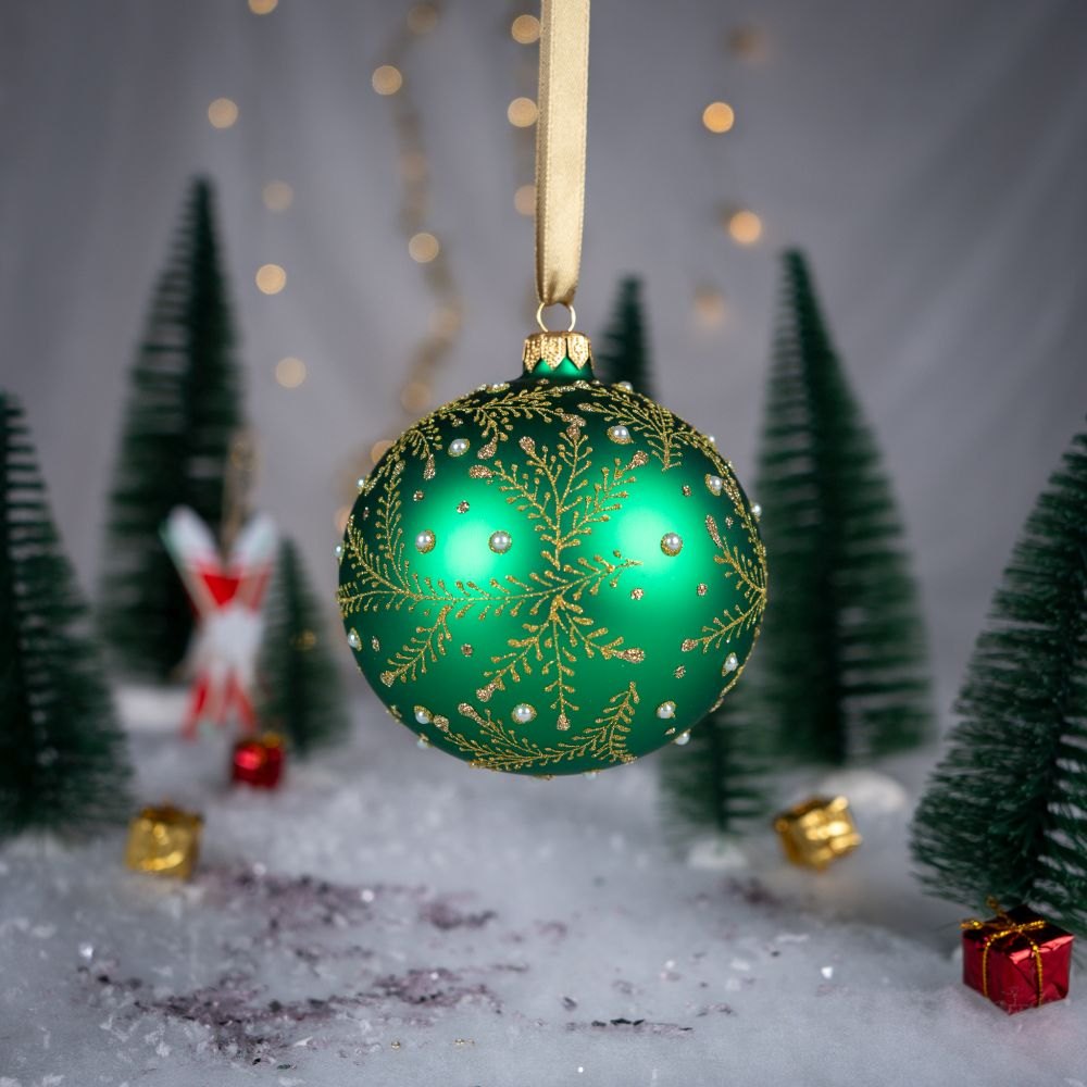 Ta elegancka bombka zachwyca intensywnym, głębokim odcieniem błękitu, który nadaje jej wyjątkowo zimowy, magiczny charakter. Na jej matowej powierzchni rozpościera się delikatny, złoty ornament przypominający gałązki świerku lub lodowe wzory malowane przez mróz na oknie. Drobne, połyskujące kryształki rozmieszczone wśród zdobień dodają bombce subtelnego blasku i tworzą wrażenie migoczących płatków śniegu.