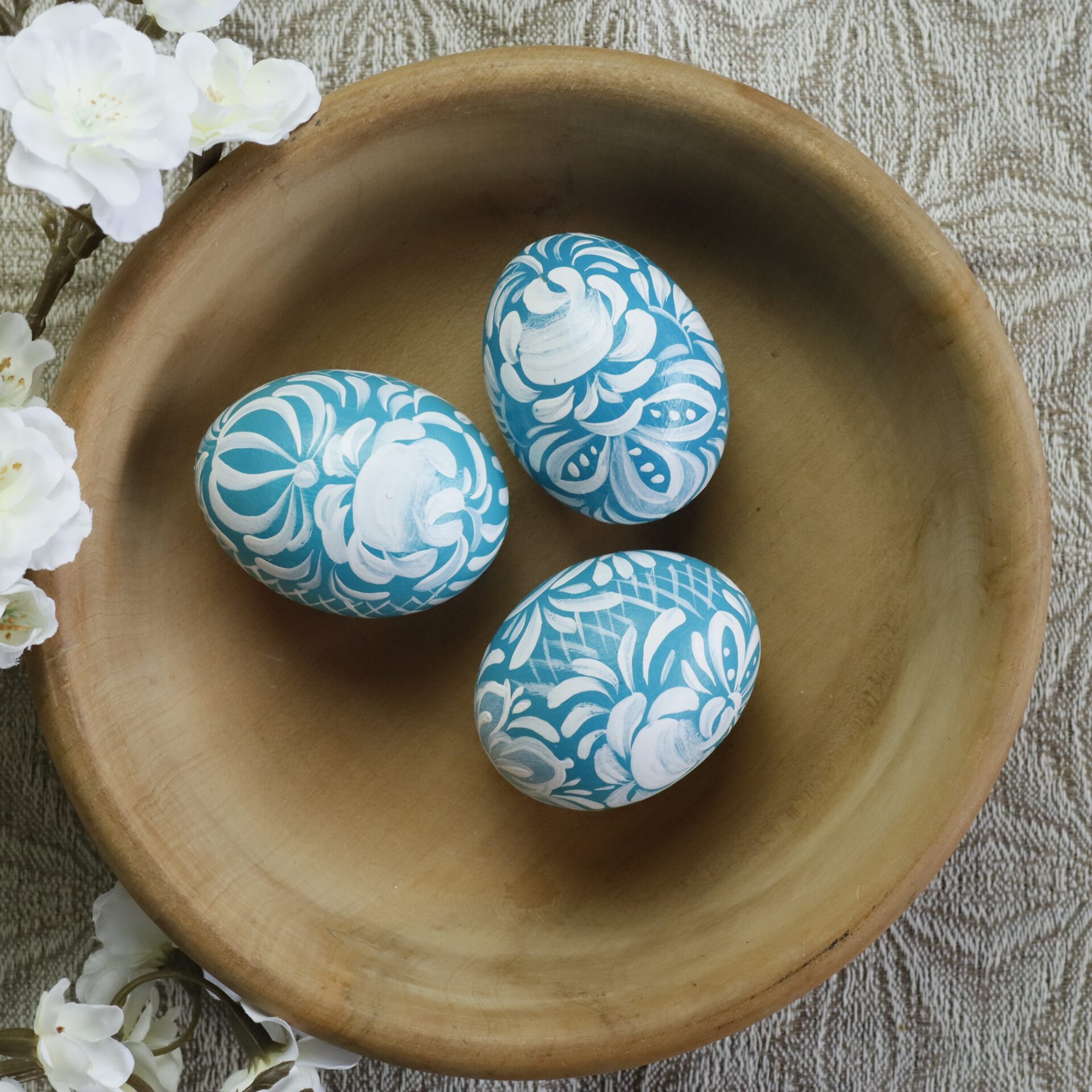 Pisanka z motywem kujawskim – Niebieska z bielą- kurza