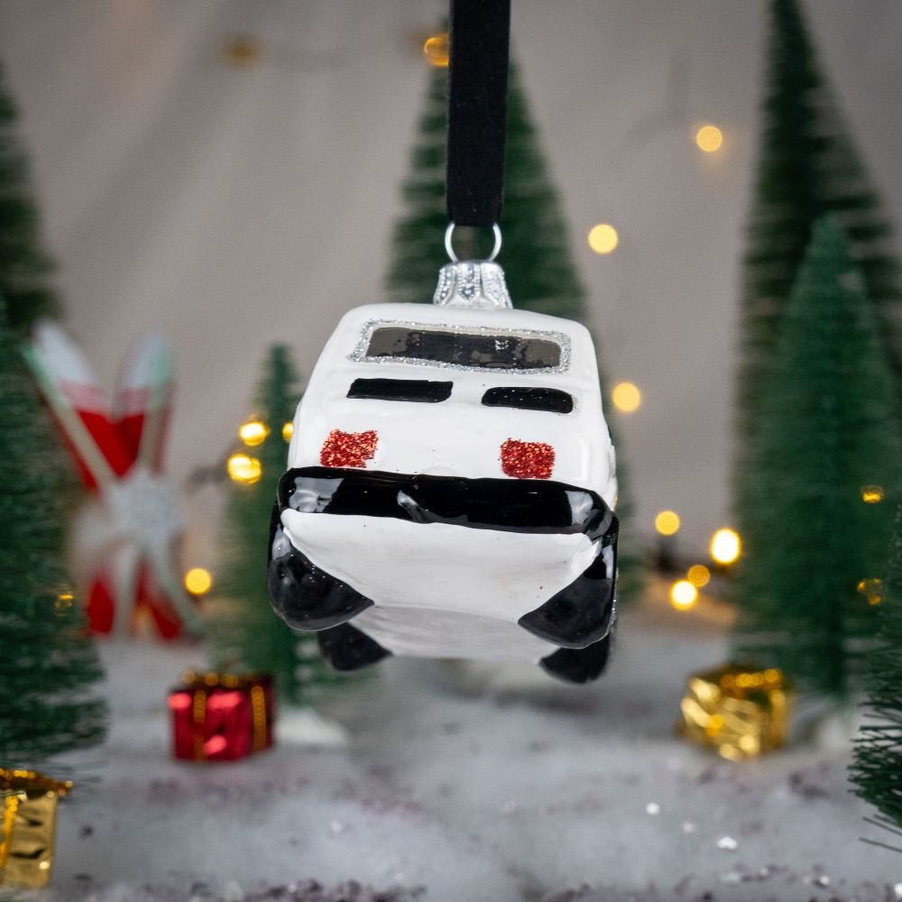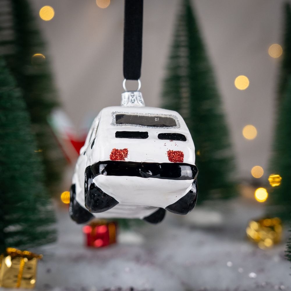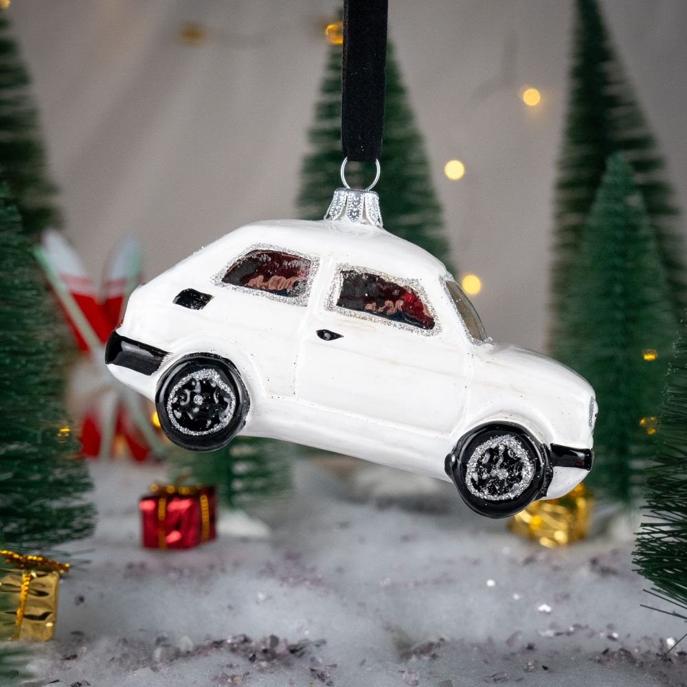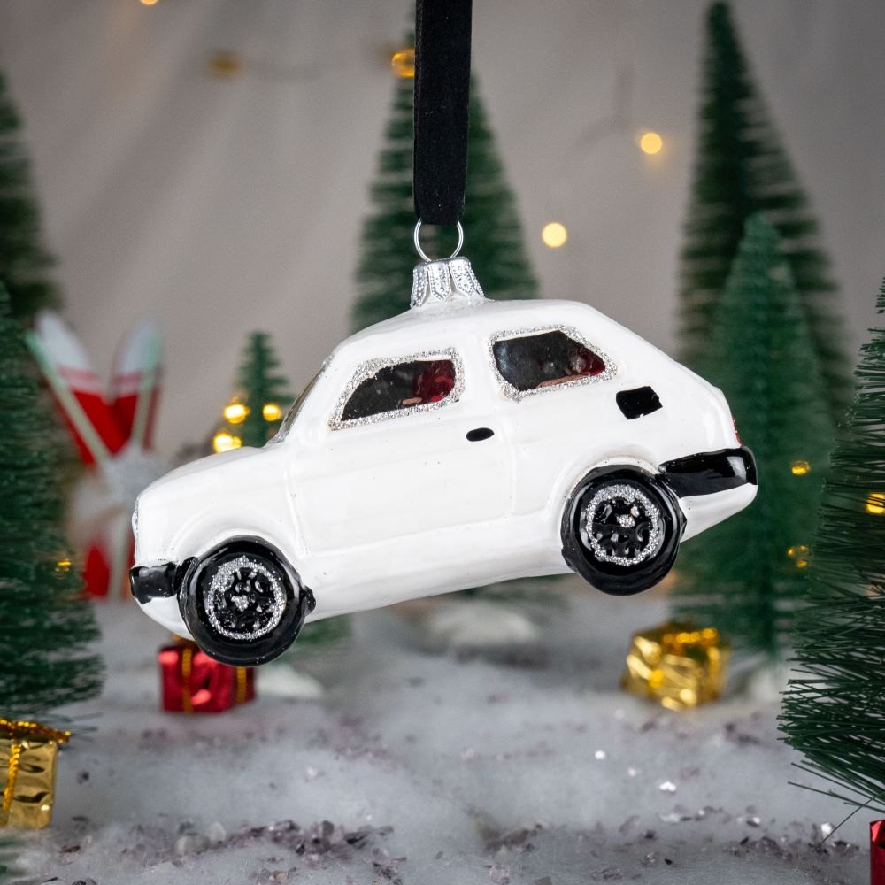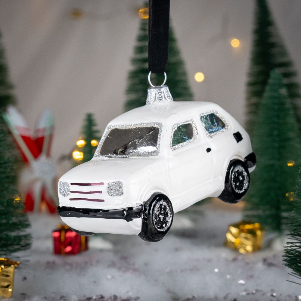 Bombka w kształcie Fiata 126 P czyli popularnego „Malucha” z lat 80′ w kolorze białym.