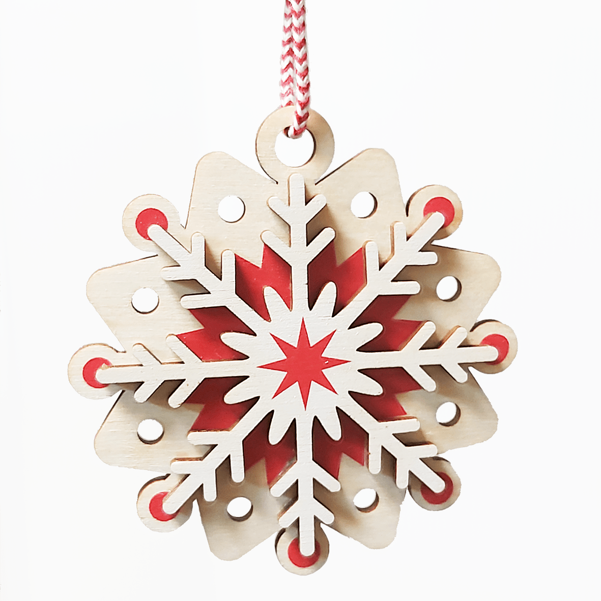 Świąteczna drewniana ozdoba w kształcie śnieżynki, ręcznie malowana w Polsce.
