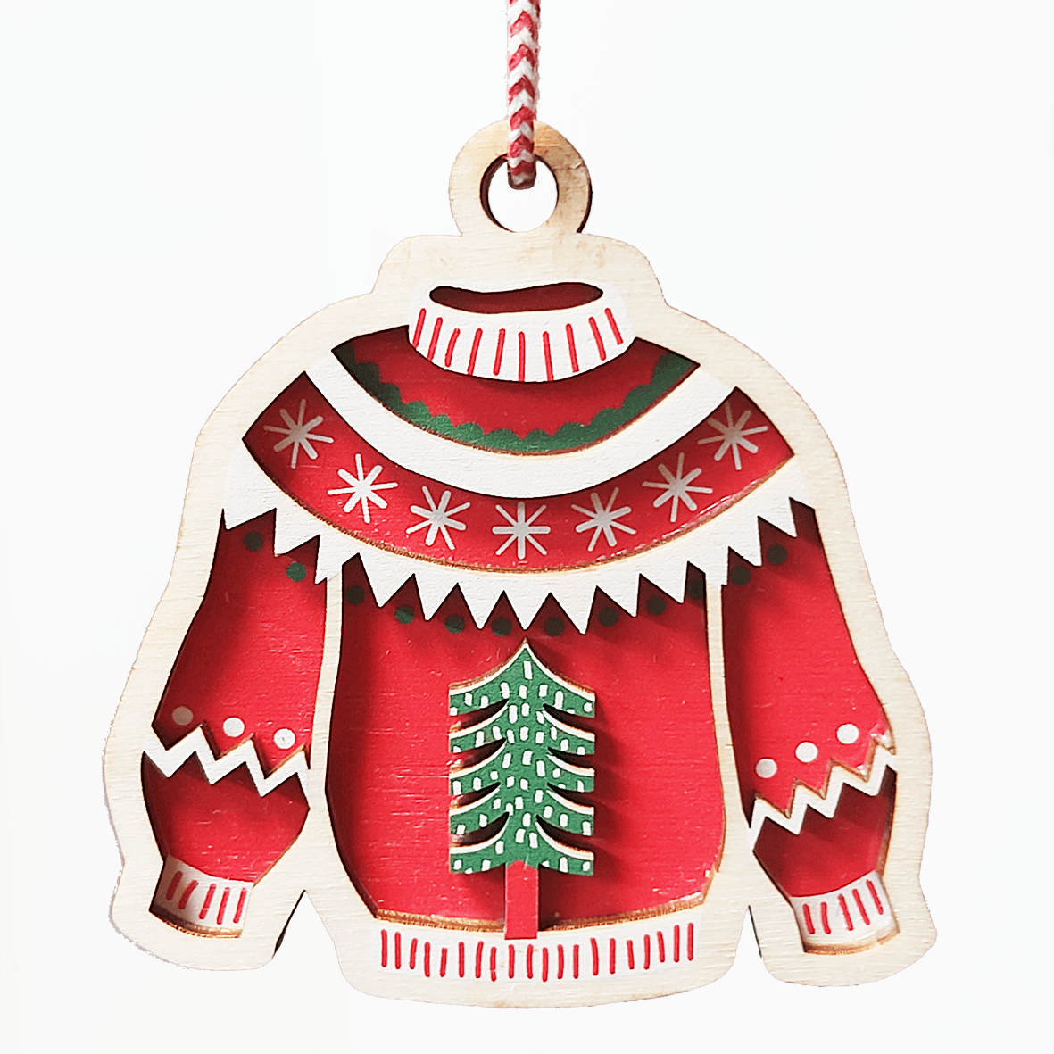 Świąteczna drewniana ozdoba w kształcie świątecznego swetra, ręcznie malowana w Polsce.