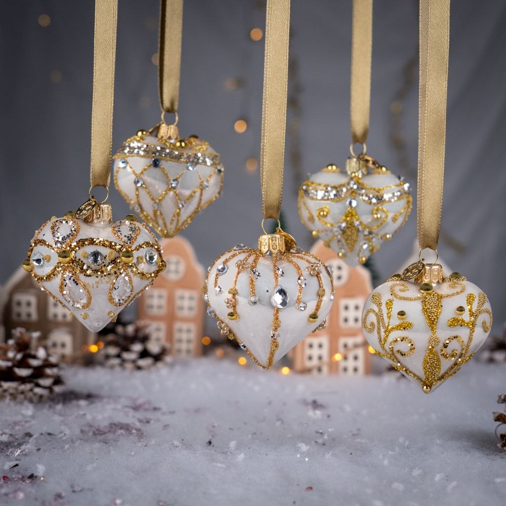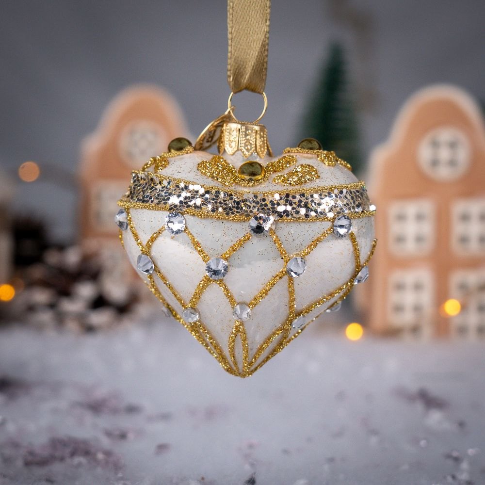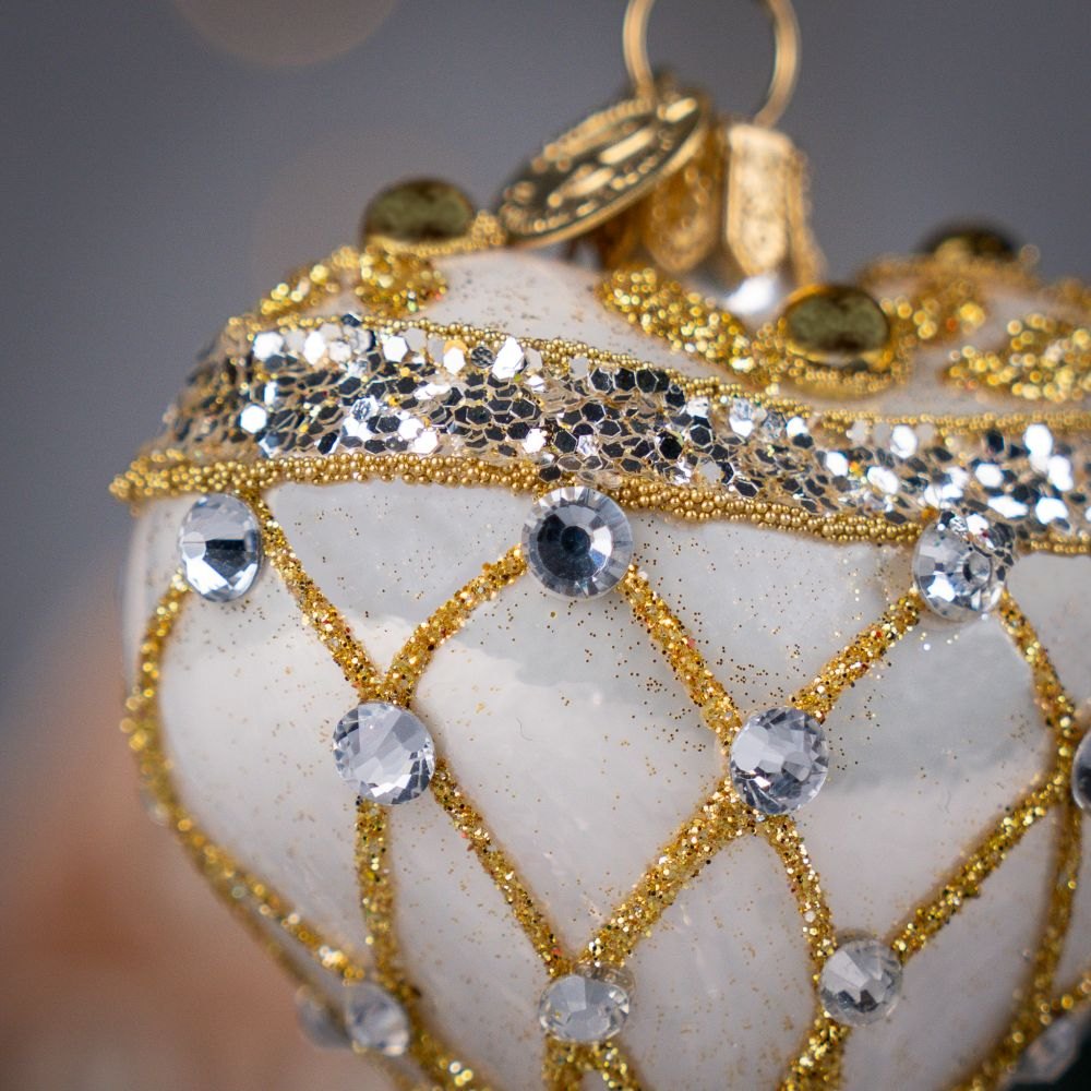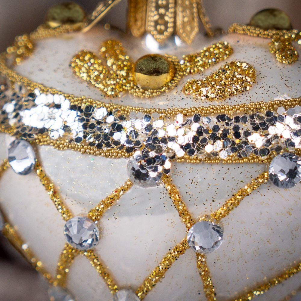 To niezwykle efektowne serce-bombka zachwyca głębokim, królewskim odcieniem perłowej bieli, który tworzy wyjątkowo szlachetny charakter dekoracji. Powierzchnię ozdabiają misternie wykonane złote ornamenty z drobnych koralików, brokatu i połyskujących cekinów. Złote perełki oraz bogato zdobione detale nadają bombce biżuteryjny styl, sprawiając, że prezentuje się niczym mały, świąteczny klejnot.