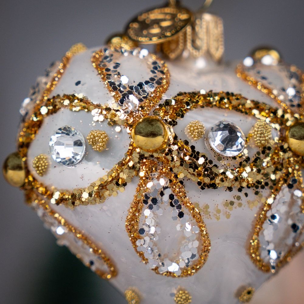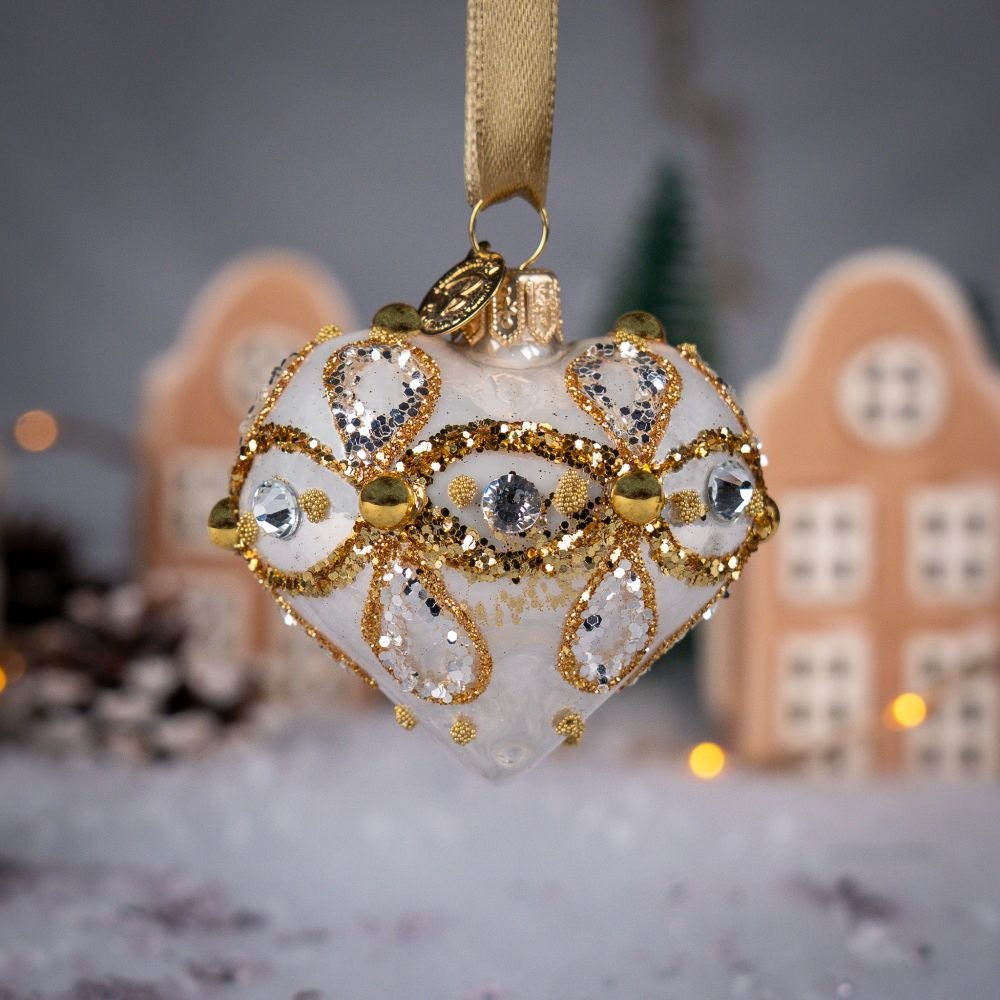 Dodaj swojej choince nutę królewskiego blasku! To wyjątkowe serce ze złotymi zdobieniami i połyskującymi detalami stworzy atmosferę elegancji i zachwyci każdego miłośnika wyjątkowych, świątecznych ozdób.