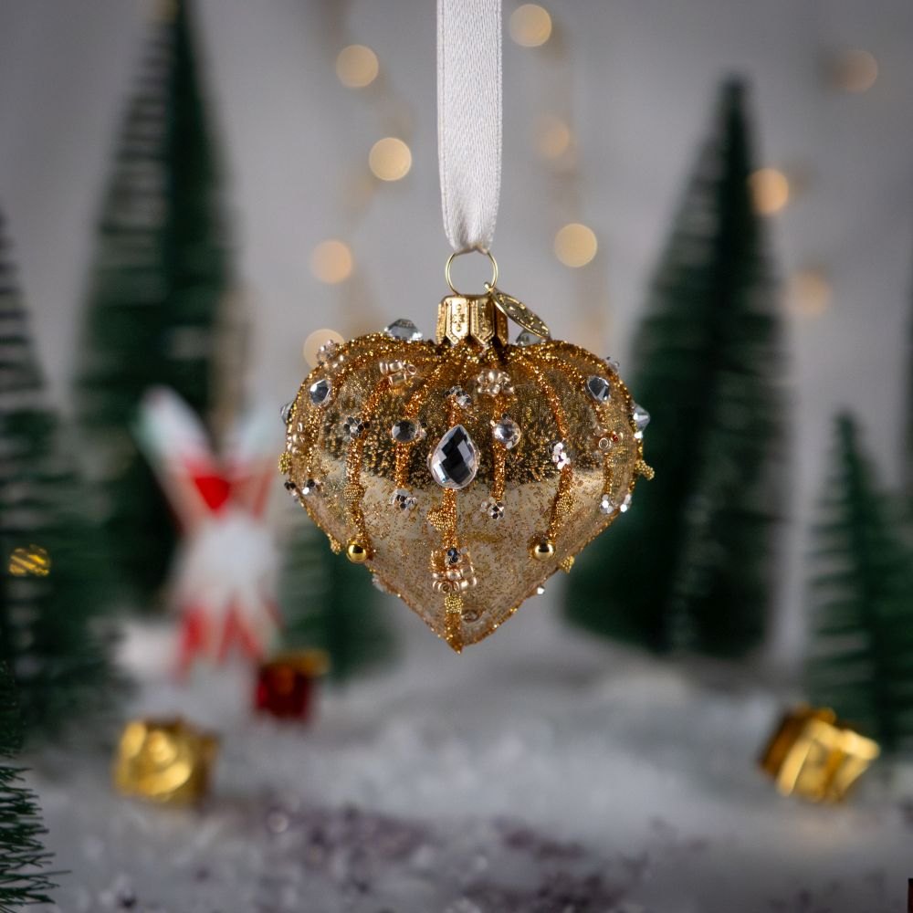 To wyjątkowe serce-bombka to kwintesencja świątecznego luksusu. Jego powierzchnia mieni się odcieniami złota, tworząc efekt rozświetlonej, niemal biżuteryjnej dekoracji. Całość pokrywają drobne brokatowe zdobienia w formie opadających, złotych strużek, przeplatane koralikami oraz błyszczącymi kryształkami i fasetowanymi kamieniami, które pięknie odbijają światło. Każdy detal został wykonany z niezwykłą precyzją, czyniąc tę ozdobę prawdziwym małym dziełem sztuki.
