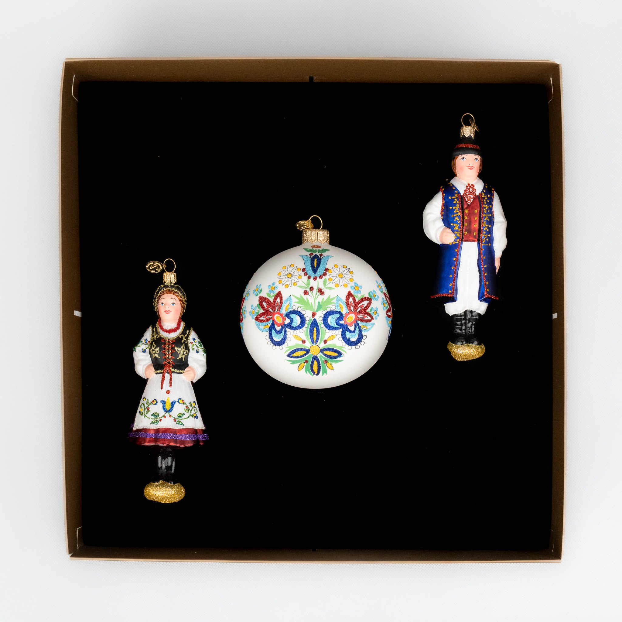 Zestaw dwóch, szklanych, ręcznie wykonanych figurek w strojach regionalnych – Kaszubka i Kaszub oraz okrągła bombka z kaszubskim haftem. Zestaw zapakowany jest w eleganckie, złote pudełko, wyścielone czarną gąbką.