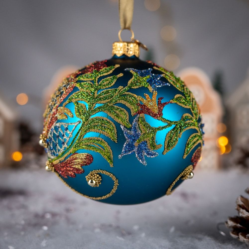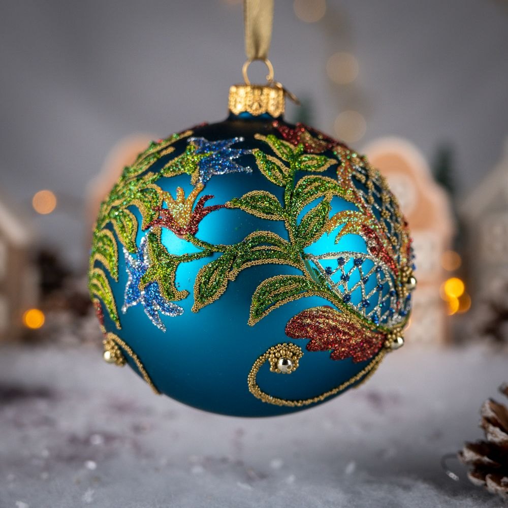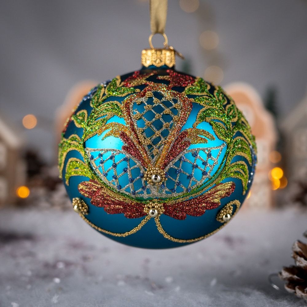 Szklana, ręcznie dekorowana, zielona bombka z barokową, roślinną kompozycją ornamentalną, sporządzoną z różnobarwnych brokatów i złotych koralików.