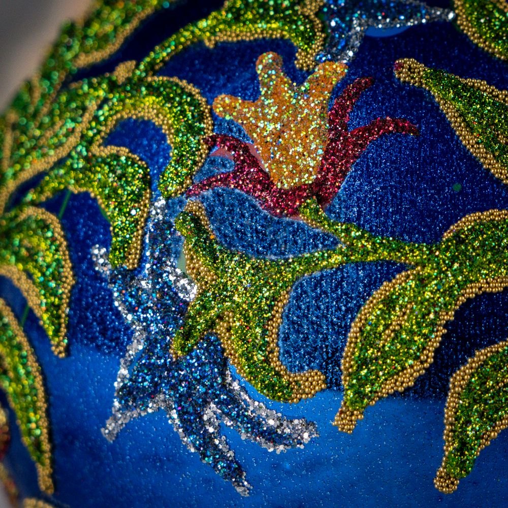 Szklana, ręcznie dekorowana, granatowawa bombka z barokową, roślinną kompozycją ornamentalną, sporządzoną z różnobarwnych brokatów i złotych koralików. Wzór inspirowany XVIII-wiecznym haftem staropolskim zaczerpniętym wprost z biskupiego ornatu. Bombka należy do Kolekcji Staropolskiej Bombkarni.