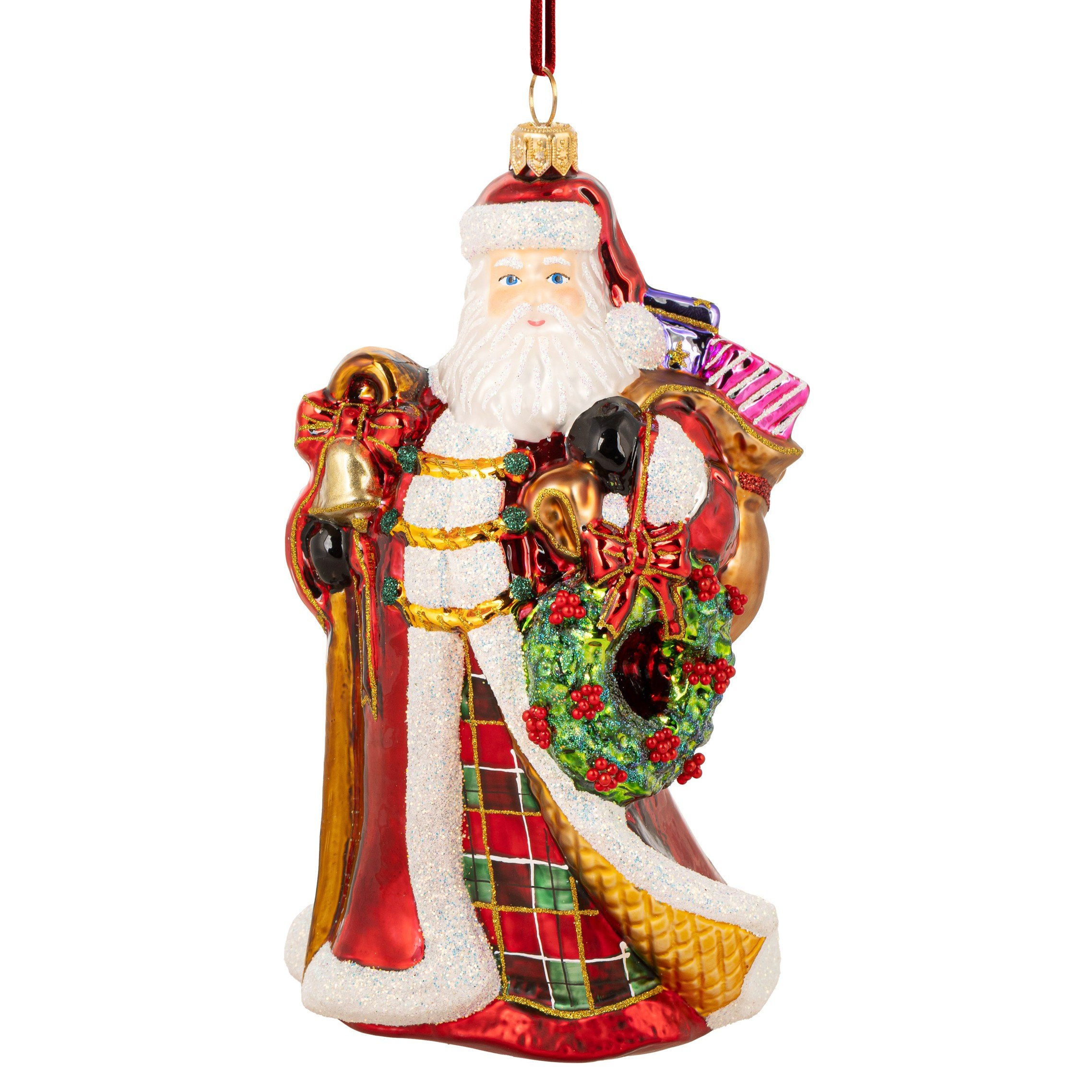 Wyjątkowa bombka przedstawiająca Świętego Mikołaja z wieńcem i workiem prezentów.