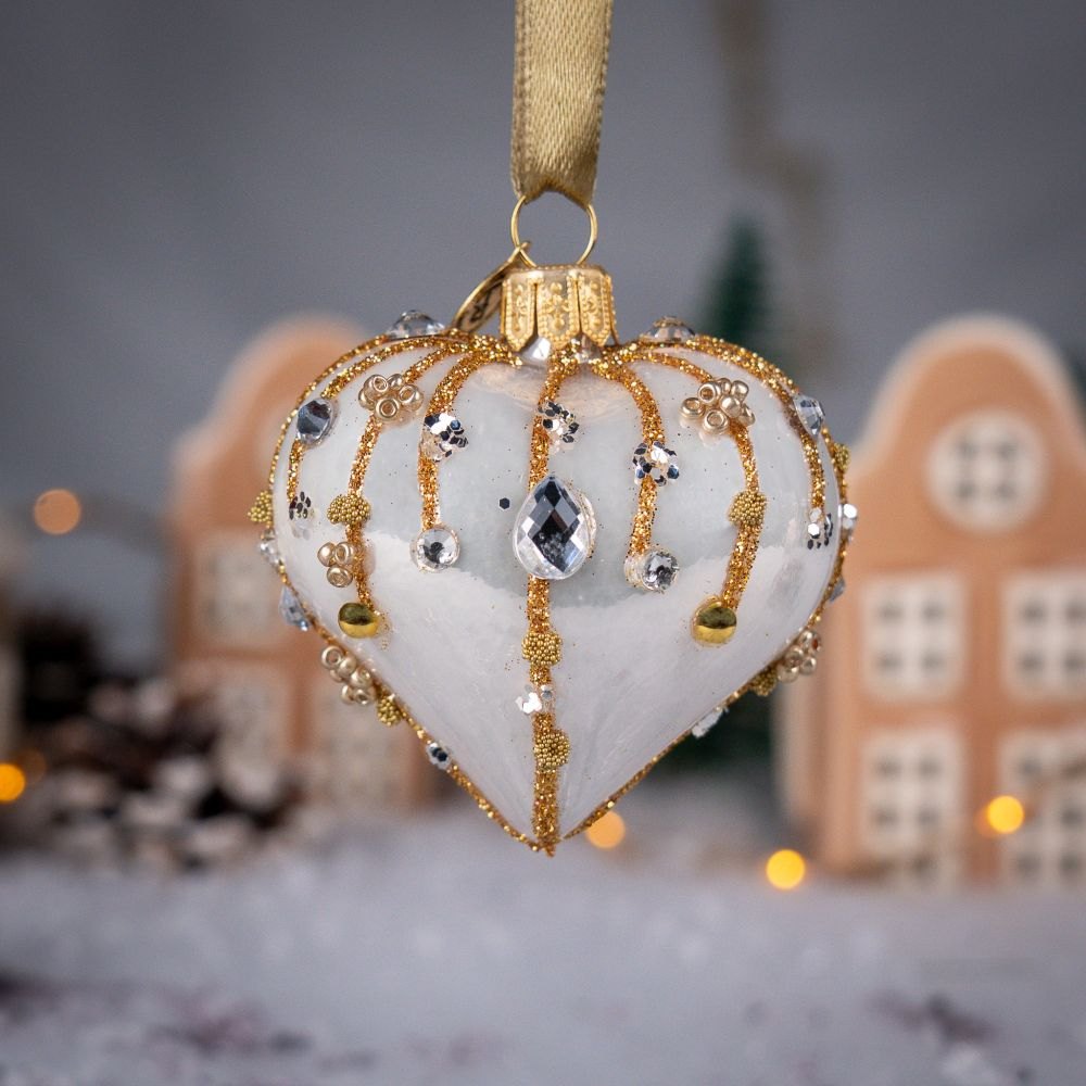 To niezwykle efektowne serce-bombka zachwyca głębokim, królewskim odcieniem perłowej bieli, który tworzy wyjątkowo szlachetny charakter dekoracji. Powierzchnię ozdabiają misternie wykonane złote ornamenty z drobnych koralików, brokatu i połyskujących cekinów. Złote perełki oraz bogato zdobione detale nadają bombce biżuteryjny styl, sprawiając, że prezentuje się niczym mały, świąteczny klejnot.