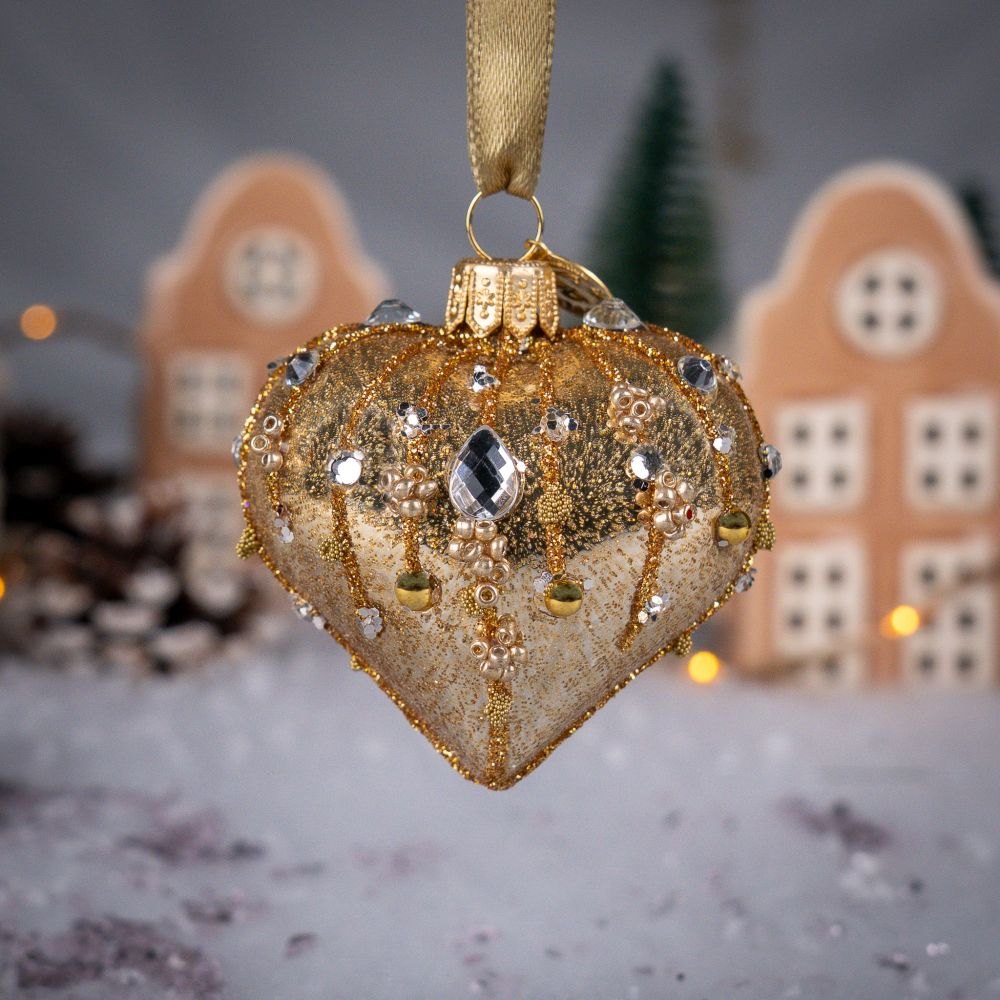 To niezwykle efektowne serce-bombka zachwyca głębokim, królewskim odcieniem złota. Tworzy wyjątkowo szlachetny charakter dekoracji. Powierzchnię ozdabiają misternie wykonane złote ornamenty z drobnych koralików, brokatu i połyskujących cekinów. Złote perełki oraz bogato zdobione detale nadają bombce biżuteryjny styl, sprawiając, że prezentuje się niczym mały, świąteczny klejnot.
