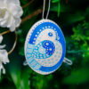 Hand-painted egg shell with a blue sparrow. Strung on a ribbon so you can hang it.