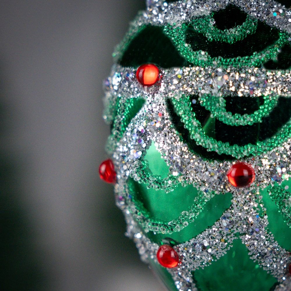 A mini glass bauble in the shape of an oval egg made by Polish artists. With its rich ornamentation it refers to the tsarist style popular in Russia. It is a jewelery work with precision down to the smallest details. The style of Fabergé eggs is the inspiration for creating patterns in this collection.
