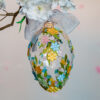 Yellow and pink flowers showered a spring glass egg. The egg sparkles with green, pink and yellow glitter. It is also distinguished by the richness of the materials used – blue beads and fabric flowers. An unusual collection, full of beauty, subtlety, grace and uniqueness. Fancy, colorful and extremely interesting patterns, combined with the original application of the egg surface, emphasize the splendor and delicacy of the baubles. It is a perfect decoration that can add charm, joy and elegance to any interior throughout the year.
