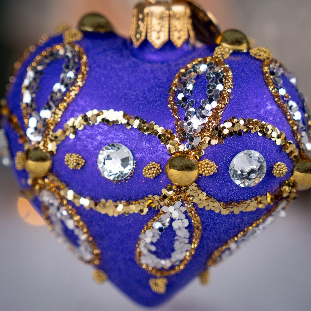 This exquisite heart-shaped ornament dazzles with its rich amethyst color, giving it an elegant and distinctly jewel-like character. The matte, velvety surface contrasts beautifully with the golden ornaments cascading from the top like shimmering streams. The decoration is crafted from tiny beads, glitter, and sparkling crystals — including a larger teardrop-shaped gem that subtly catches the light.