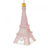 Mouth blown and hand painted ornament in the shape of the Eiffel Tower.